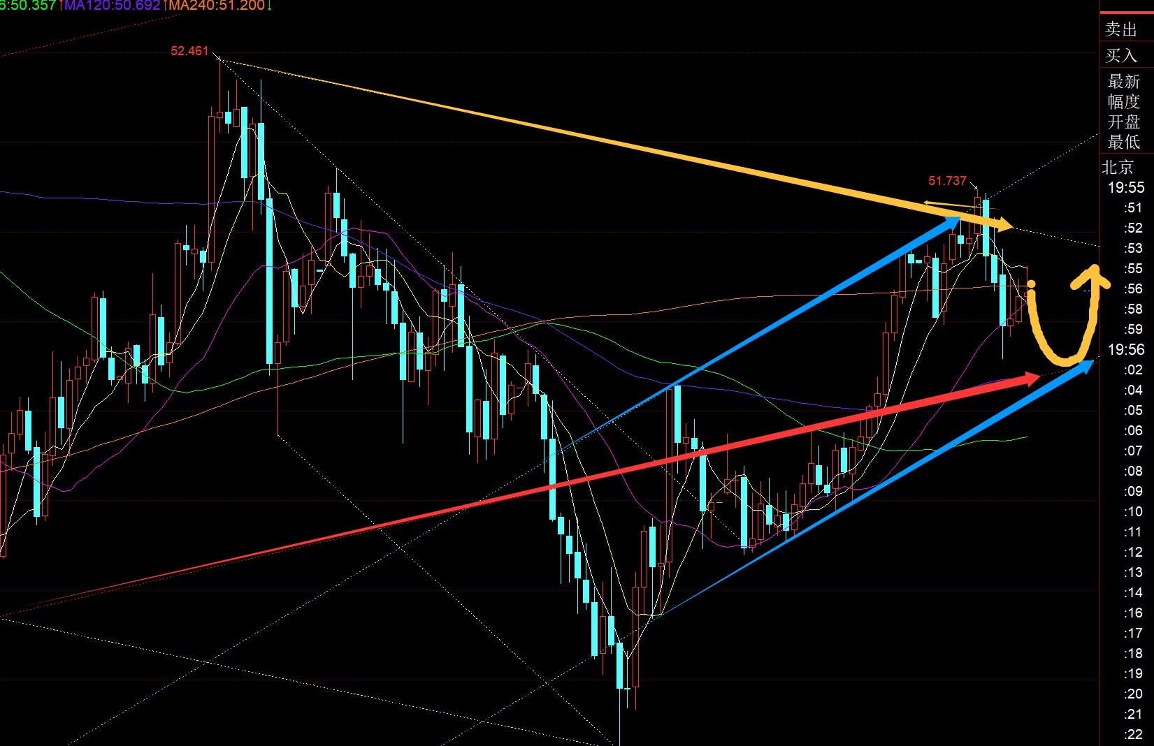 白银方面:它的走势形态和黄金差不多,日线昨日收报大阳,今日回踩确认短期5日和10日均线,看它们的企稳情况; 从上图看,51.6-51.55存在趋势阻力压制,蓝色通道下轨和前期红色通道下轨共振支撑于50.7-50.6,此位置上逢低继续看涨为主;