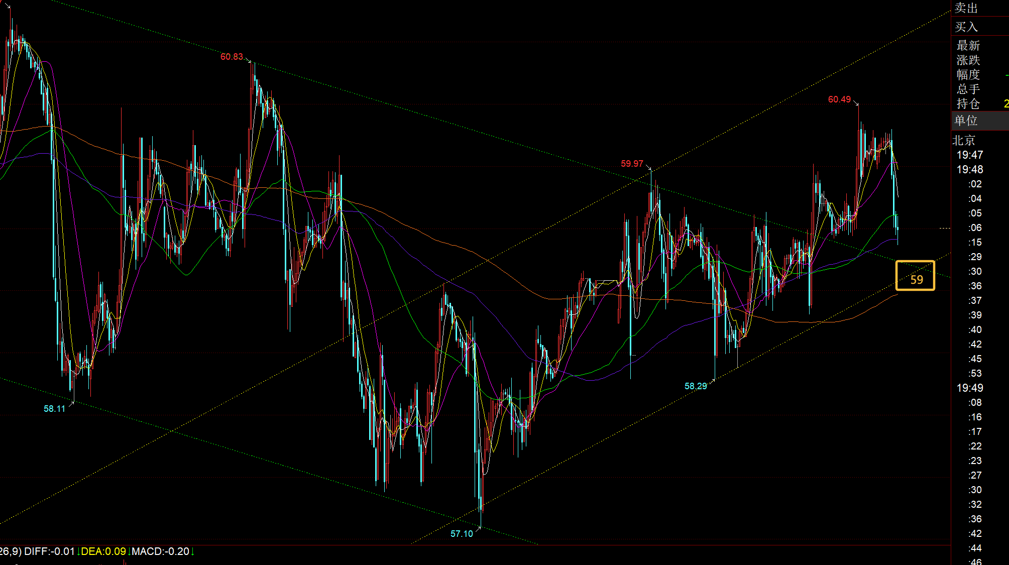 原油方面: 今日关注两通道交叉位置59支撑得失,若再度打压跌破此处,并且向下走了一波持续下滑,那么重回原来下行通道,第二日再按照上周通道内上下轨震荡即可;反之,若企稳59,向上走了一波持续拉升,那么走上行反弹通道;
