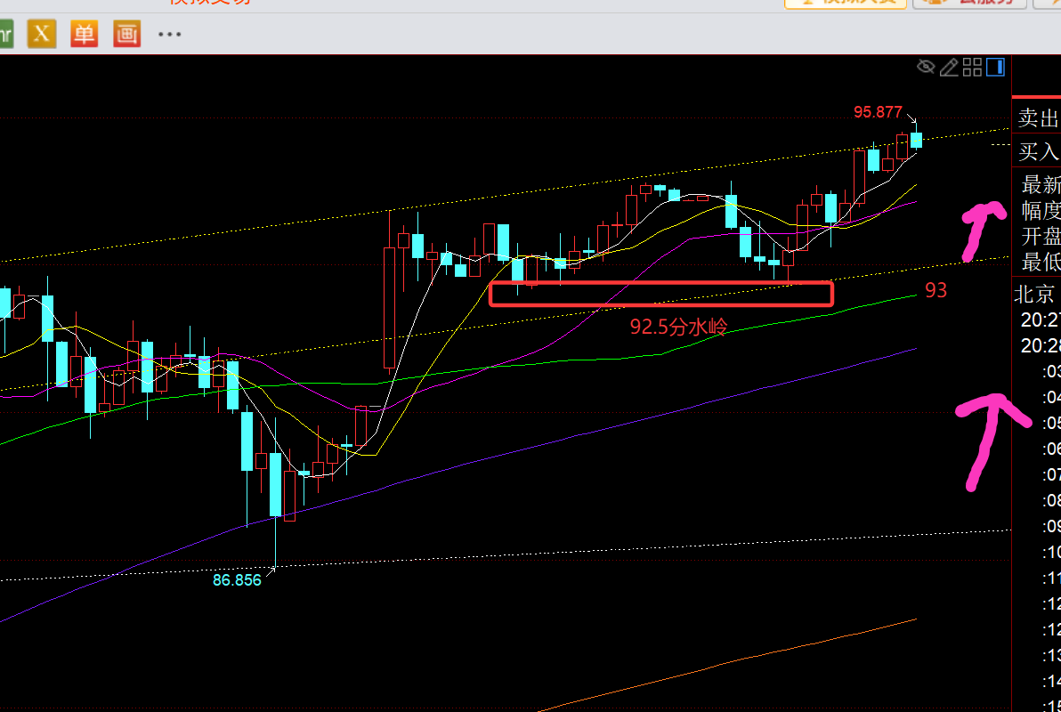 第二,白银方面:昨日开盘也是成功一波拉升,触及94一线,上周五给出的88波段北上,也就顺利减持;后续一直运行于相对高位整理,给不到预期90-91继续波段北上机会;
