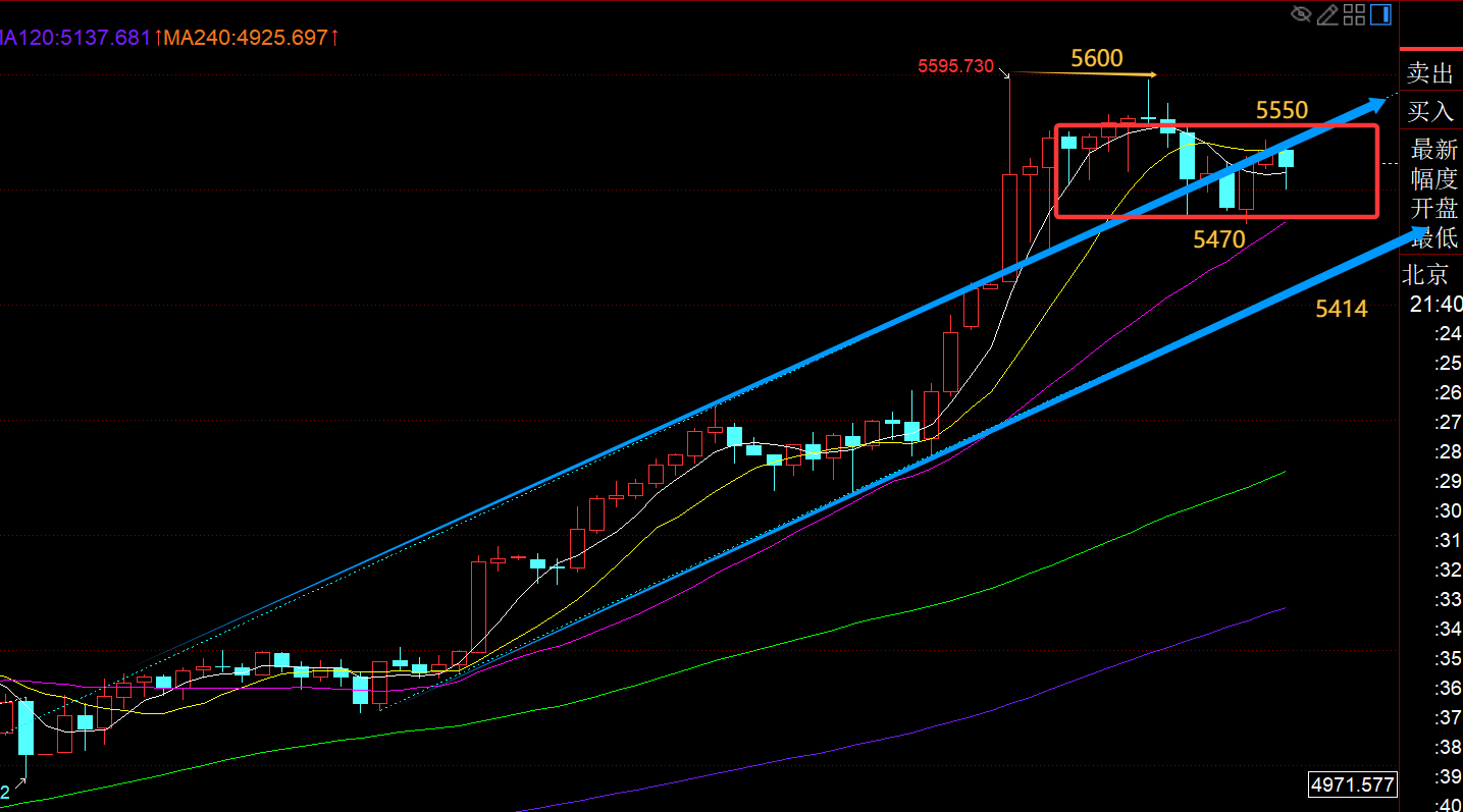 第一,黄金日线级别:昨日收报下影线长于上影线的纺锤体阴K,低点暂时企稳于4274-5598的382分割支撑5093上,今日目前出现大阴K,失守5均线,直接刺破了10均线5020,低点打到了50分割支撑4936上;那么作为一波强势单边拉升,修正的最大程度一般是短期均线,而10均线比较关键,因为守住它,则还能继续维持强势逼空状态,很快过几日又会爬升高位;若守不住10均线,那么就可能试探中轨,也是作为强势行情,最后的底牌;并不是说,失守了中轨,短趋势就改变了;而是失守了中轨,想要再回归强势单边格局,就要花更多的时间来整理酝酿,类似3500、4381那两次的整理;所以,今晚我们暂时盯住10均线的得失情况,以及50分割支撑4936的得失,能收盘稳住,且处于10日附近不远,那么下周初还是有很大希望尽快恢复强势拉升格局;