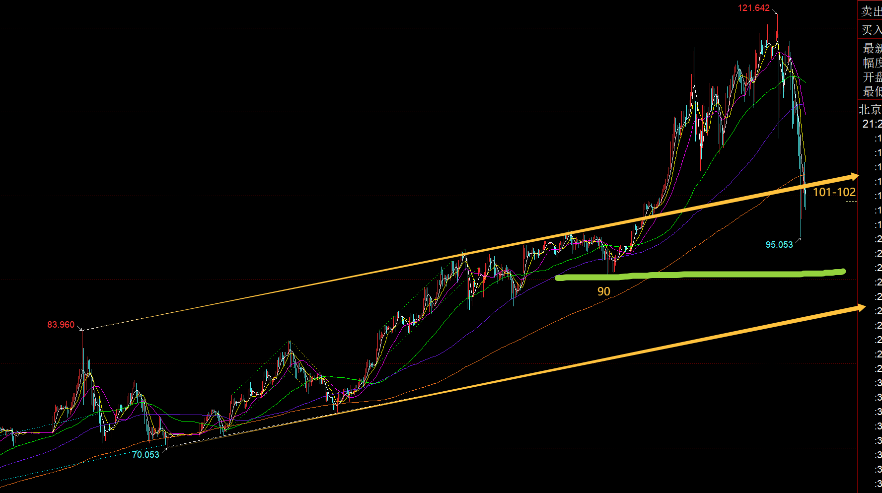 白银方面:从日线级别看,它也击穿了10均线,当日跌幅目前已达15%,非常狠,又创下历史以来单日最大跌幅;70-121.6这轮单边拉升,也刚好回踩试探了50分割位置95一线,中轨支撑上移91-90,这两个位置是关键了,能稳住它们,整体上还能维持相对强势,回归拉升时间会短一些;若失守90关口,那么短期内要上去就很难,得花更多时间来震荡酝酿整理,短趋势方向北上是不会改变的;从图中看,打入了前期黄色通道内,今晚看上轨101-102能否重新突破站上,若可以,那么短期低点可以逐步出来,下周一就可以很快拉涨回去;
