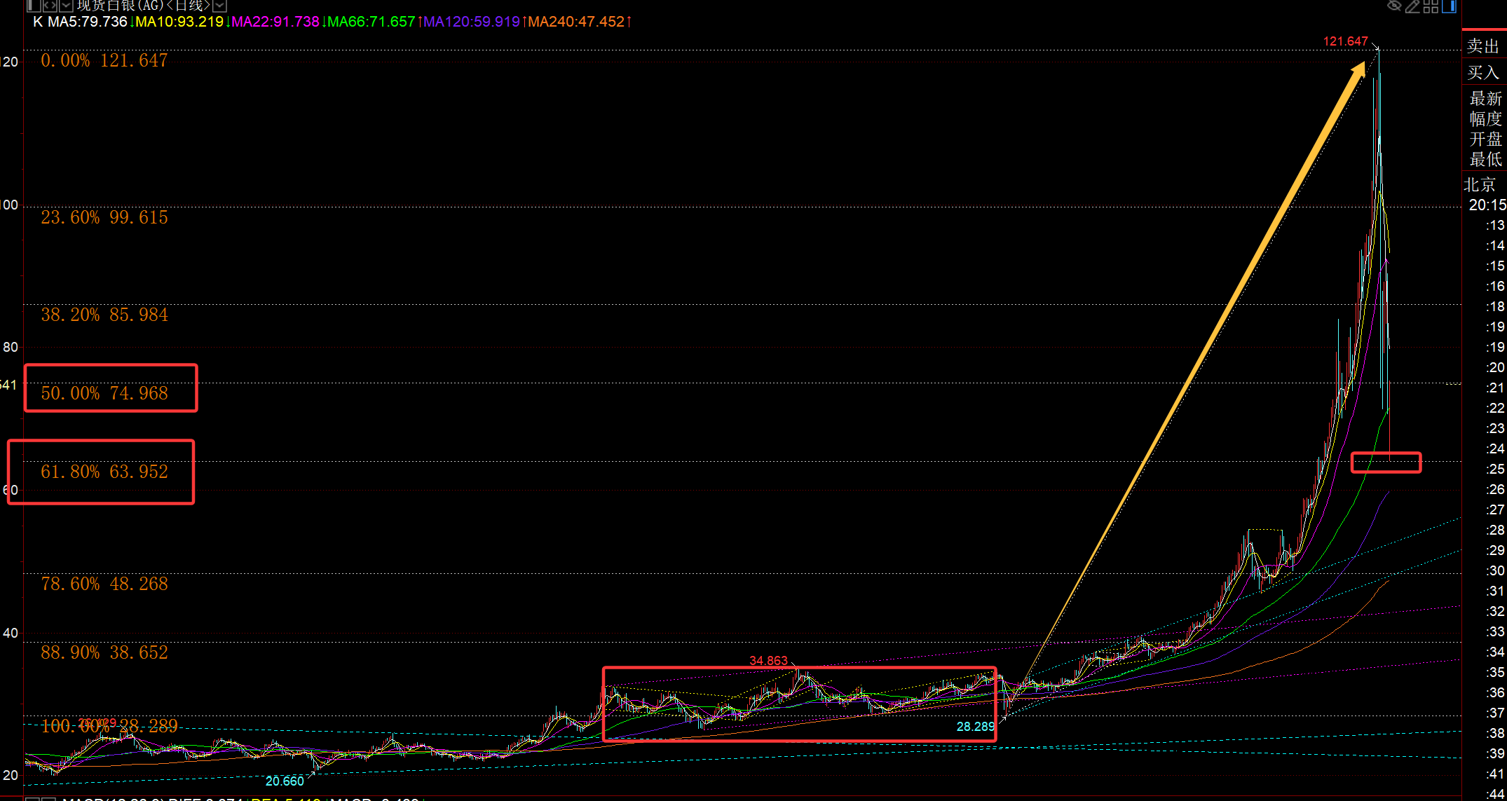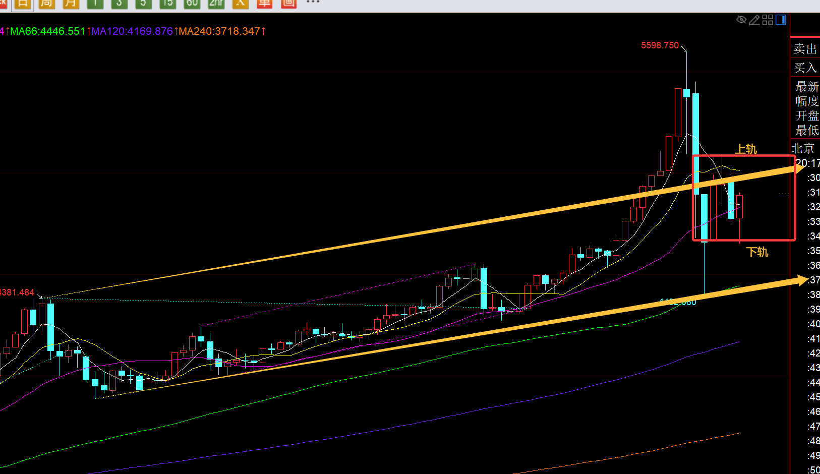 第一,黄金方面:首先,月线触及5均线已到位,4403就基本已经是阶段性底部低点,强势牛市单边拉升都是依托5均线;其次,周线本周基本也是收报长下影K,代表低点的企稳拉升;最后,日线是处于一波快速砸盘修正,之后当前步入箱体区间内的整理,上轨基本锁定5000-5100,下轨今日也基本显露,大概4660一线;在这个区间内进行反复运行,最终只要某一天收盘有效站上10均线,就基本会有望突破上轨,那么紧接着就会再次冲击历史高位5400-5600;