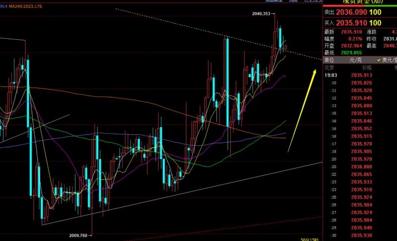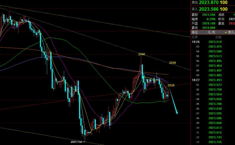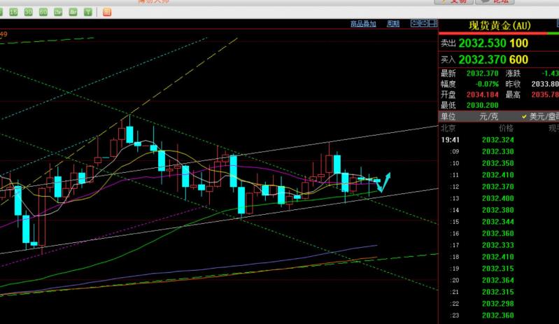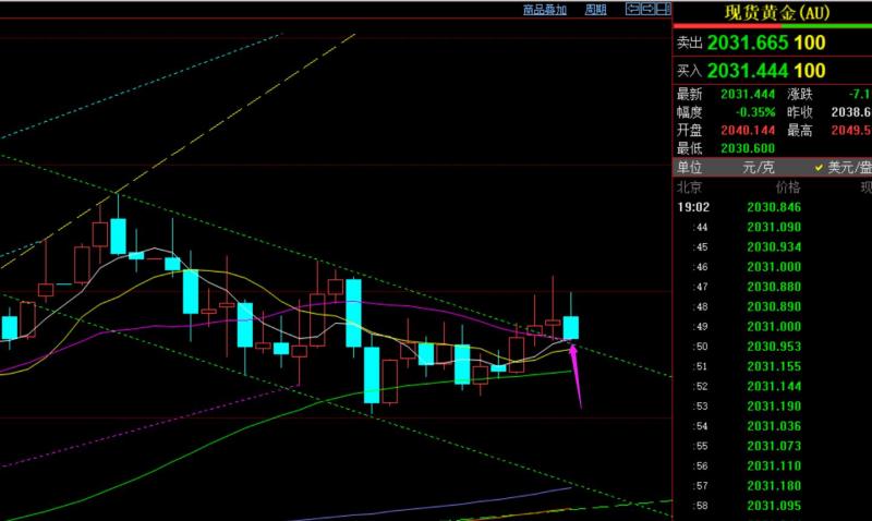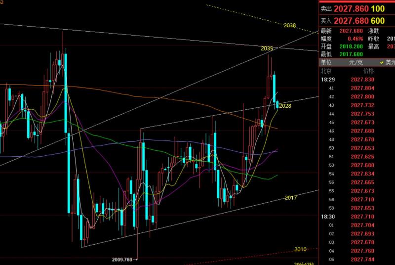 郑氏点银:黄金短期仍处于下跌调整状态,原油反复拉低看涨 回顾上周五行情走势及出现的技术点: 第一,黄金方面:上周五亚欧盘是一路震荡慢涨走高,当2023通道反压点无法阻挡时,就认为下一个承压点要关注2040一线,它是处于2062-2002反抽618分割阻力,也是2062-2058前高趋势阻力线衍生承压点,最