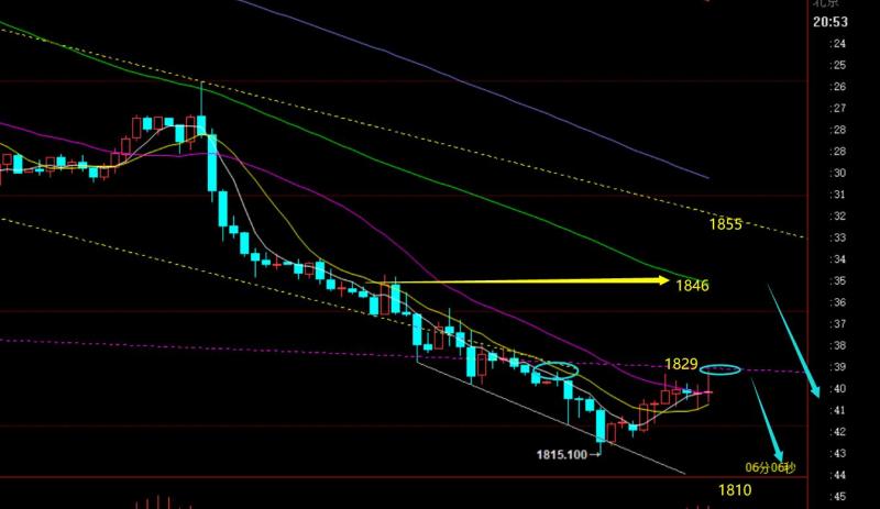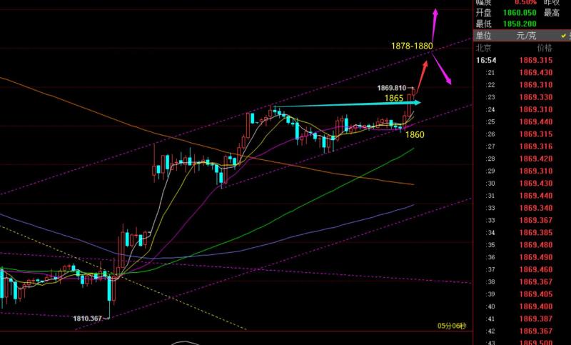郑氏点银:黄金断崖式下挫,底部整理区间仍未产生,油仍强 回顾上周五行情走势及出现的技术点: 第一,黄金方面:上周五亚盘横盘后,欧盘连阳上涨,则认为美盘初先下滑,还有二次拉升动作,给出1867上继续先看反弹,最终抵达1878,也就是符合上周五隔夜上图中4小时通道下轨支撑18
