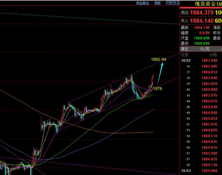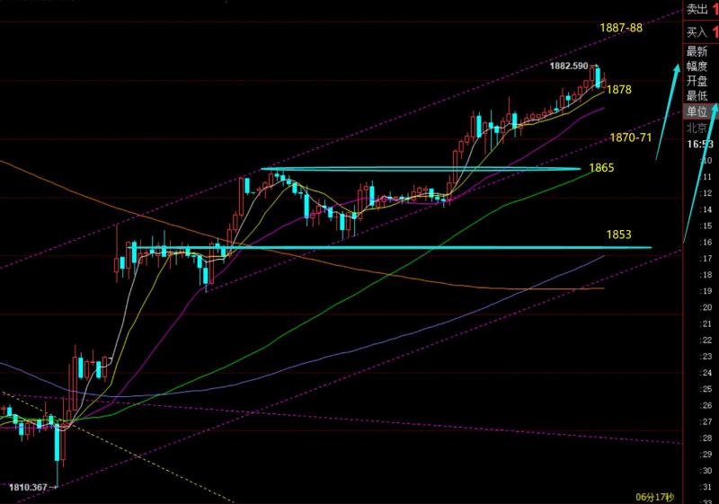 郑氏点银:黄金持续看涨抵达首轮目标1880,下探仍看涨为主 回顾昨日行情走势及出现的技术点: 第一,黄金方面:昨日亚盘横盘于趋势支撑上,欧盘连阳发力,美盘二次延续走高,符合日内继续看涨思路;盘中给出1856多、1860多、1865多、1870多,最终今日触及1880第一轮阶段目标;