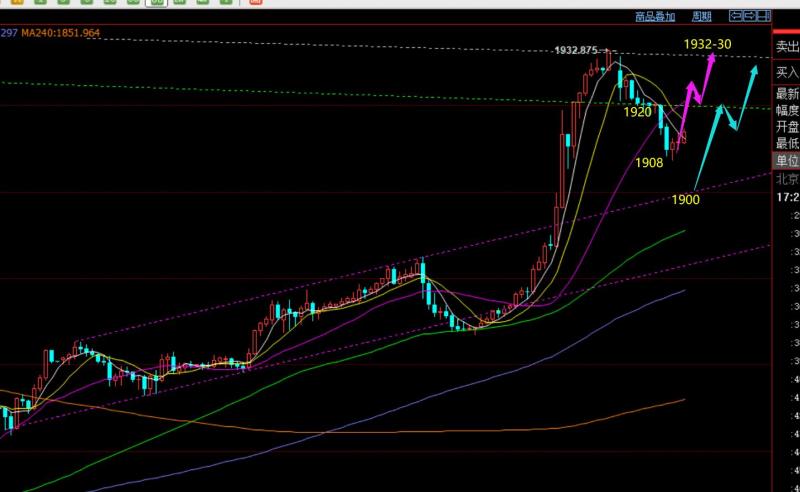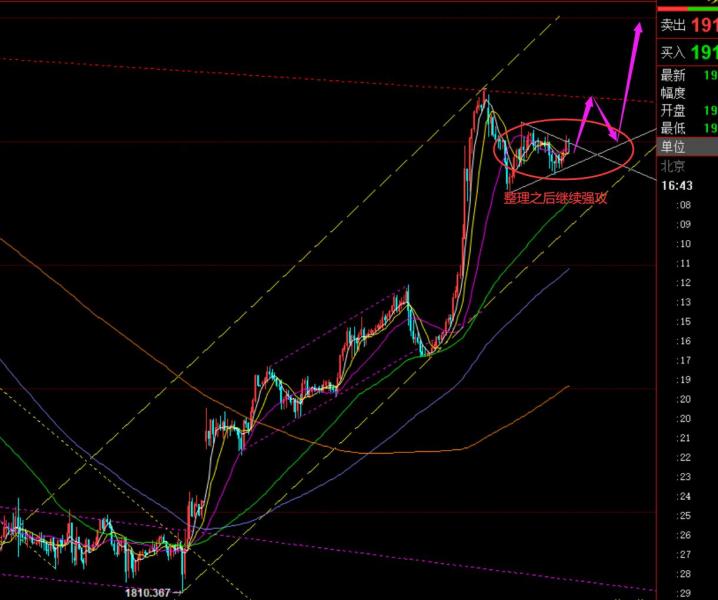 郑氏点银:黄金大涨后步入高位修正,原油也存在一些修正再企稳 回顾上周五行情走势及出现的技术点: 第一,黄金方面:上周五亚盘直接碎步慢涨,突破站上小时线中轨1874后开始有些发力上冲,美盘冲破1894通道反压后,直接大阳加速猛拉,日内只有唯一的一次修正就是1918至1905,短暂修正就是继续看