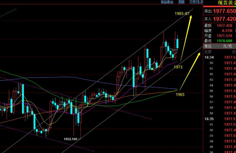 郑氏点银:黄金来回大幅穿梭不延续震荡,原油接着单边拉升 回顾昨日行情走势及出现的技术点: 第一,黄金方面:周末指出金价将走宽幅来回震荡,没想到却来的如此之快;当周一收阳继续反弹后,按小时线宽幅运行通道来讲,想着先拉升给到通道上轨1979-78下再去反手看跌,进行宽幅上下区间整