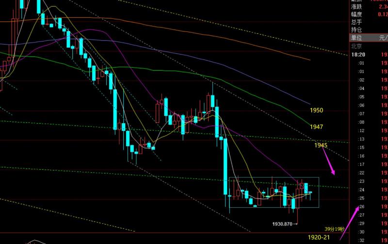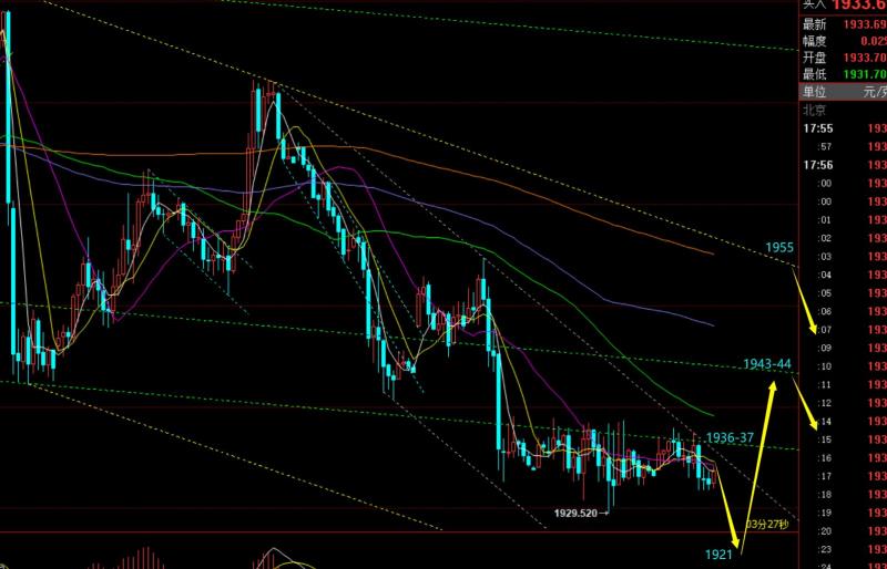 郑氏点银:黄金留意拐点支撑1921,原油回归强势拉升 回顾昨日行情走势及出现的技术点: 第一,黄金方面:昨日一天运行于1938-1930之间,底部窄幅压制横盘,打不开空间,且没明确运行方向;盘中安排1935多,先预判先反弹修正至1944-45,再1950下进行打压回落,但等到美盘前,始终无力站上1938,担