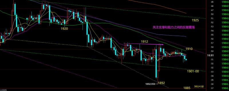郑氏点银:黄金探底拉升1900再次争夺,原油继续震荡反弹 回顾昨日行情走势及出现的技术点: 第一,黄金方面:昨日亚盘承压1912-13下行,欧盘触及1902再次企稳,给出1904短多,抵达1912目标,美盘数据全利空,一下子全跌回去,且失守1900-02通道支撑,但由于并未先回抽确认,也就不去跟空,直接一口气