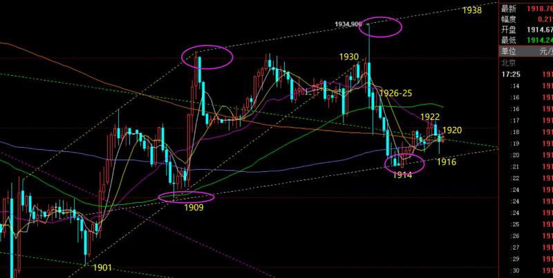 郑氏点银:黄金1916逢低先尝试看企稳,原油71上仍看涨 回顾昨日行情走势及出现的技术点: 第一,黄金方面:昨日亚欧盘符合预判,价格企稳1920迎来一波震荡拉升,刚好触及1935目标;而后半夜的一波回测力度在预期之外,价格失守了支撑节点,同时防守点1915刚好运气不好被刺破一点; 第