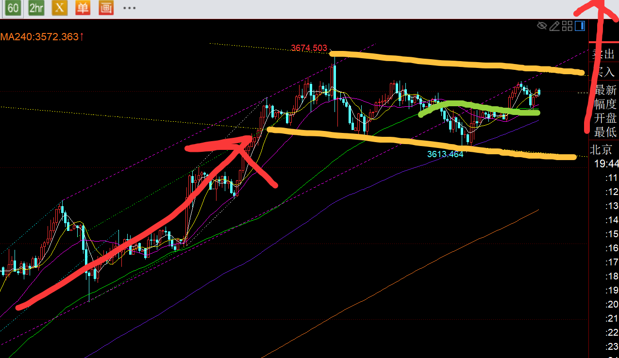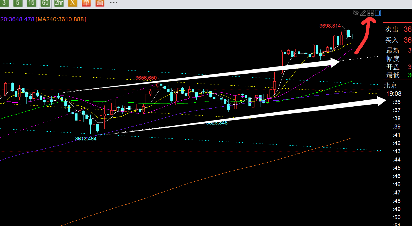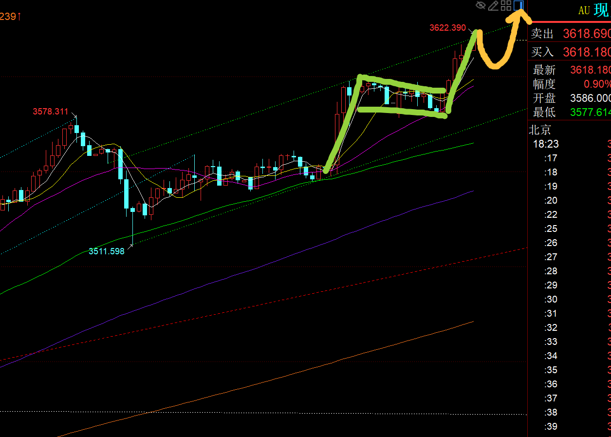 郑氏点银:黄金站稳3600关口,今晚3640之上继续看涨 回顾昨日行情走势及出现的技术点: 第一,黄金方面:牛一旦发威起来,就是不回头,只会一路的往前冲,冲,冲!昨日早间先横盘整理,午后靠近小时线中轨3580一线则先继续跟随看涨,欧盘很快连阳发力,冲击抵达3610目标收金豆子;因为靠近了短期上涨