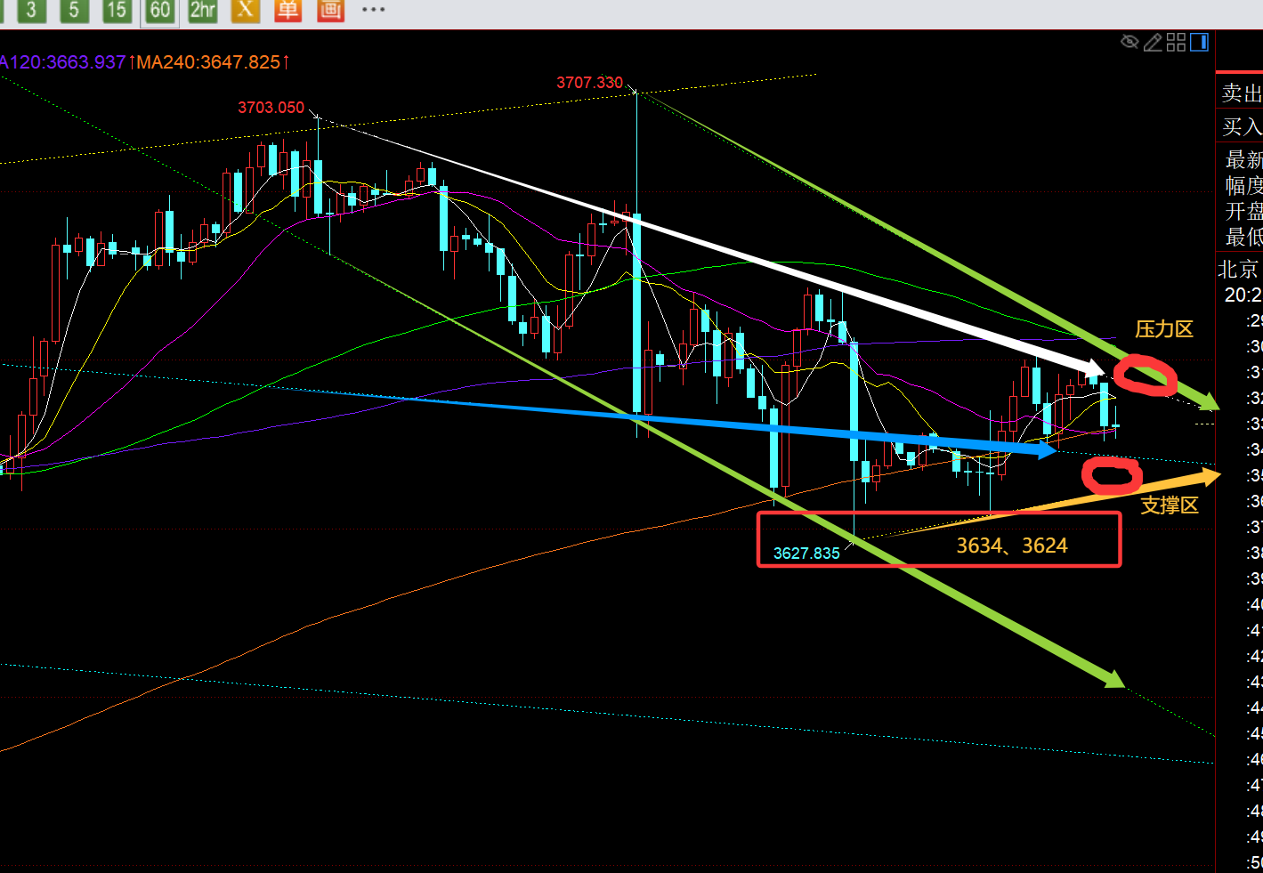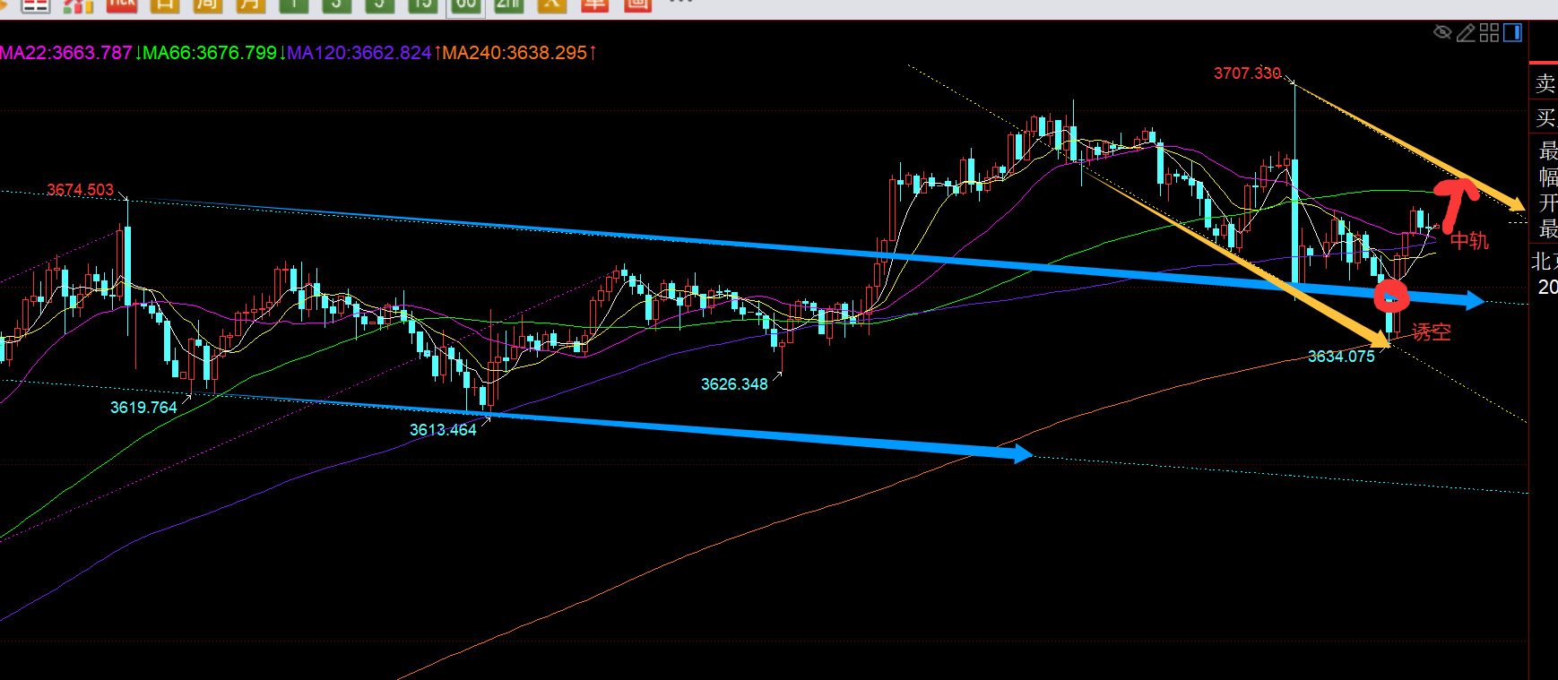 郑氏点银:黄金日线短期均线逐步粘合,仍要横盘整理 回顾昨日行情走势及出现的技术点: 第一,黄金方面:昨日一天都在来回撸串,日内短线变化急速,亚盘,欧盘,美盘来回V,没延续性;亚盘延续隔夜下跌一波,这个可以理解,欧盘跌至3634又马上大阳反拉,就是图中蓝色通道上轨的一种诱空假破位,随后欧