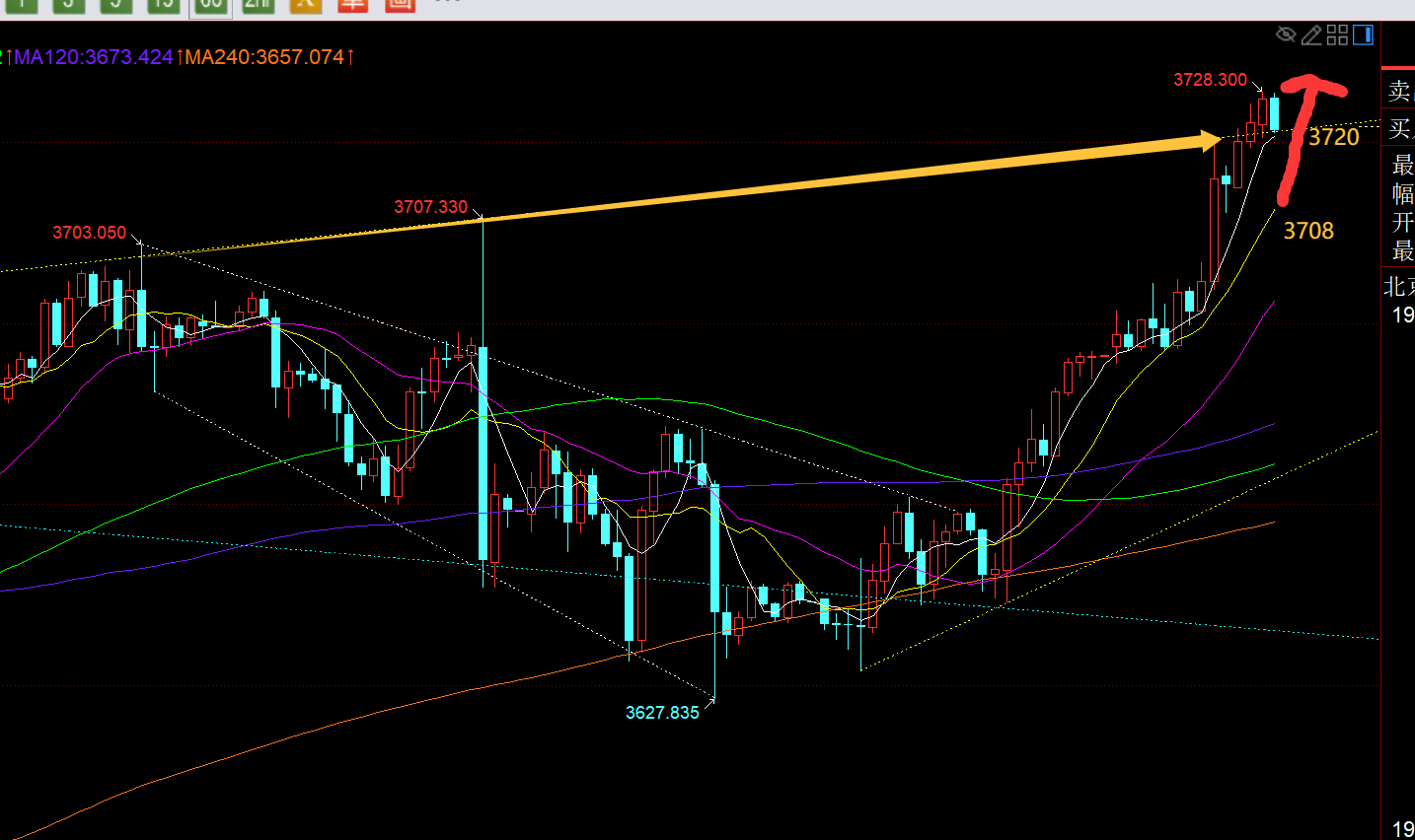 郑氏点银:黄金高位强势横盘扫荡,依然看好进一步刷历史新高 第一,黄金方面:昨日算是一言难尽;前日不管是早间3616看涨,还是欧美盘3630看涨都不给入场机会,全部踏空上涨利润;昨日早间触及上行通道下轨附近,靠近66日均线支撑,则3640上提前尝试看涨,的确企稳拉升了,但只给到3649,离目标差几米,离减仓差1