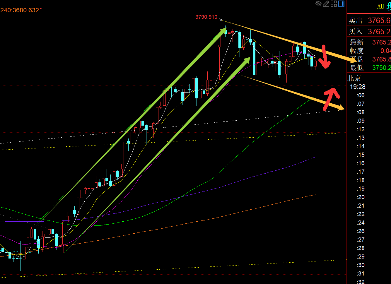 郑氏点银:黄金短线步入震荡修正,早间3780下看压制成功 回顾昨日行情走势及出现的技术点: 第一,黄金方面:前日隔夜强势拉升于高位,昨日早间依托3740上直接看续涨一波,成功抵达3755;午后回踩一波,依托短期通道下轨支撑,以及小时线中轨之上稳定,3740上继续看涨,再次成功抵达3758