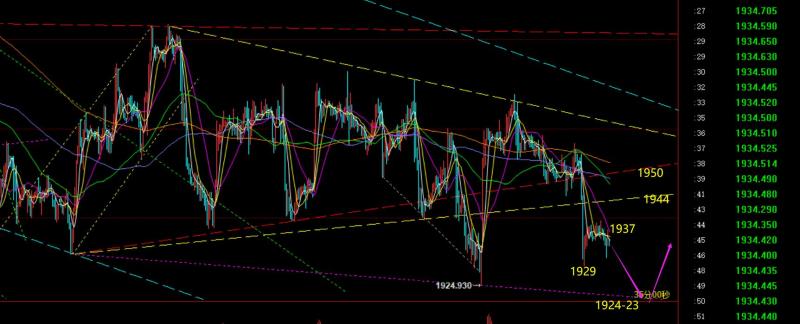 郑氏点银:黄金1926上再看探底拉升,原油回测关注71 回顾昨日行情走势及出现的技术点: 第一,黄金方面:昨日亚欧盘持续压制小时线中轨,以及凌晨高点,或382分割阻力,那么仍处于弱势结构,因此1936直接继续看跌,最终抵达1924-23目标,并挂单反手进场,成功探底拉升至1937一线,一方面