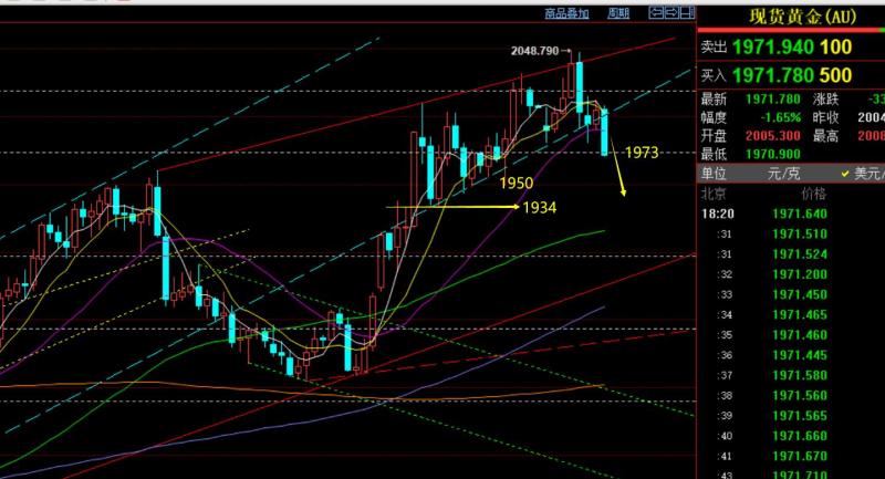 回顾昨日行情走势及出现的技术点: 第一,黄金方面:周二日线收阳,仍站稳于日线通道回踩支撑线上,因此昨日而言,回测是先跟多的,但价格大幅度下滑,直接破位1981周二低点,隔夜的涨幅直接洗回去;当欧盘小时线连阴下行,按规律来讲,美盘反抽可以看二次下跌,不过当昨日底部出现一根大阳包几阴后,就强调先