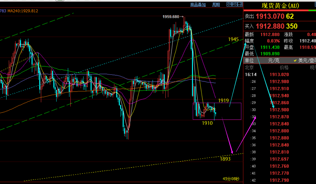 郑氏点银:黄金两日重创百金,短期见顶形态明确 回顾上周五行情走势及出现的技术点: 第一,黄金方面:上周五非农前,黄金一直处于1918-1910区间内窄幅横盘,亚欧盘整体保持低位弱势,按技术形态来讲美盘存在进一步的下跌;但由于非农数据预期和前值对比,在结合AD小非农公布值,市场预期大非农是