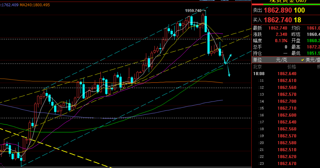 郑氏点银:黄金失守日线通道下轨,或进一步打开下行空间 回顾昨日行情走势及出现的技术点: 第一,黄金方面:昨日亚欧盘原本思路是维持隔夜的箱体震荡通道内运行,上轨阻力1867一线,也刚好是日线10均线,触及看跌回落;下轨支撑1848一线触及看涨反弹,但欧盘迎来持续的连阴破位行情,失守1848,且破