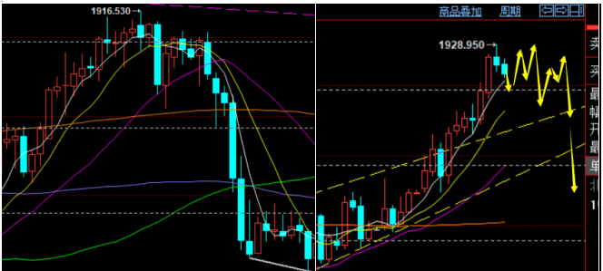 郑氏点银:黄金日内先扬后抑,原油短期初步见顶转弱 回顾昨日行情走势及出现的技术点: 第一,黄金方面:昨日早盘承压1911下连跌下行,失守隔夜小双底支撑1903-04,连阴形态也不错,按照这个走势,正常就是反弹顶底位置1903-04再去进一步看跌,但欧盘直接连阳反攻,算是一种日内洗盘;一路小逼空至192