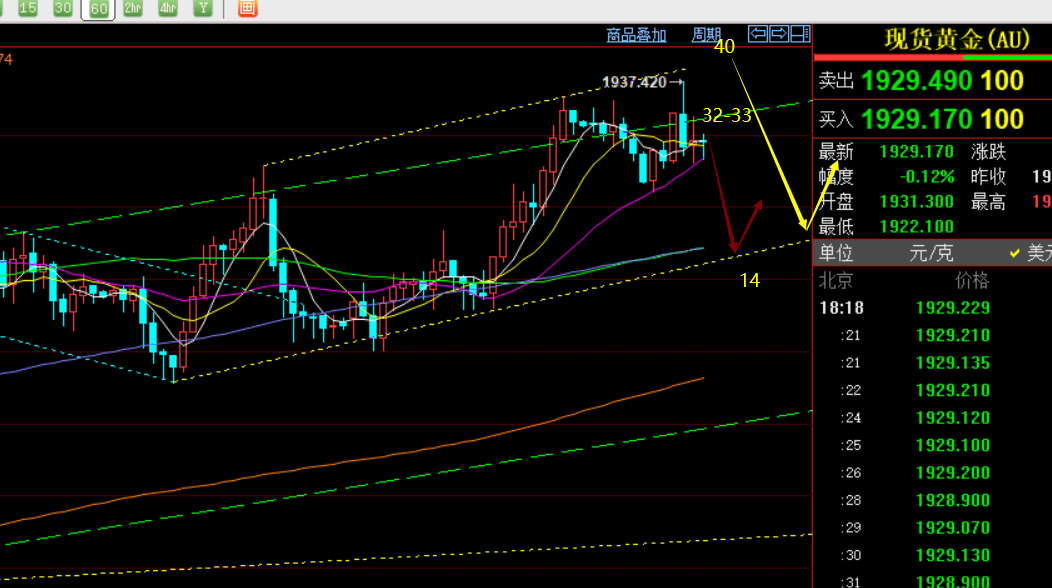 郑氏点银:黄金摸顶成功,空头将趁胜追击,油同步见顶 回顾昨日行情走势及出现的技术点: 第一,黄金方面:昨日整体幅度不大,围绕1930-1920这10美金之间反复穿梭震荡,指出只要1935未突破站上前,就是维持弱势压制看跌为主,盘中给出1931、1930、1929、1929.5反复围绕1930阻力附近多次短