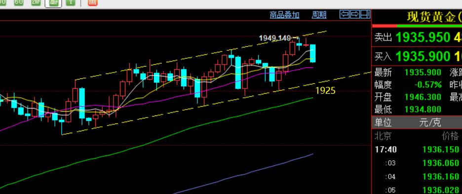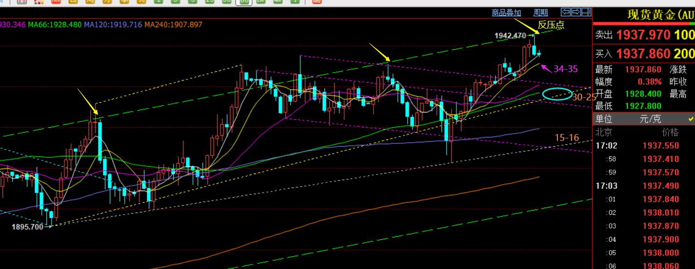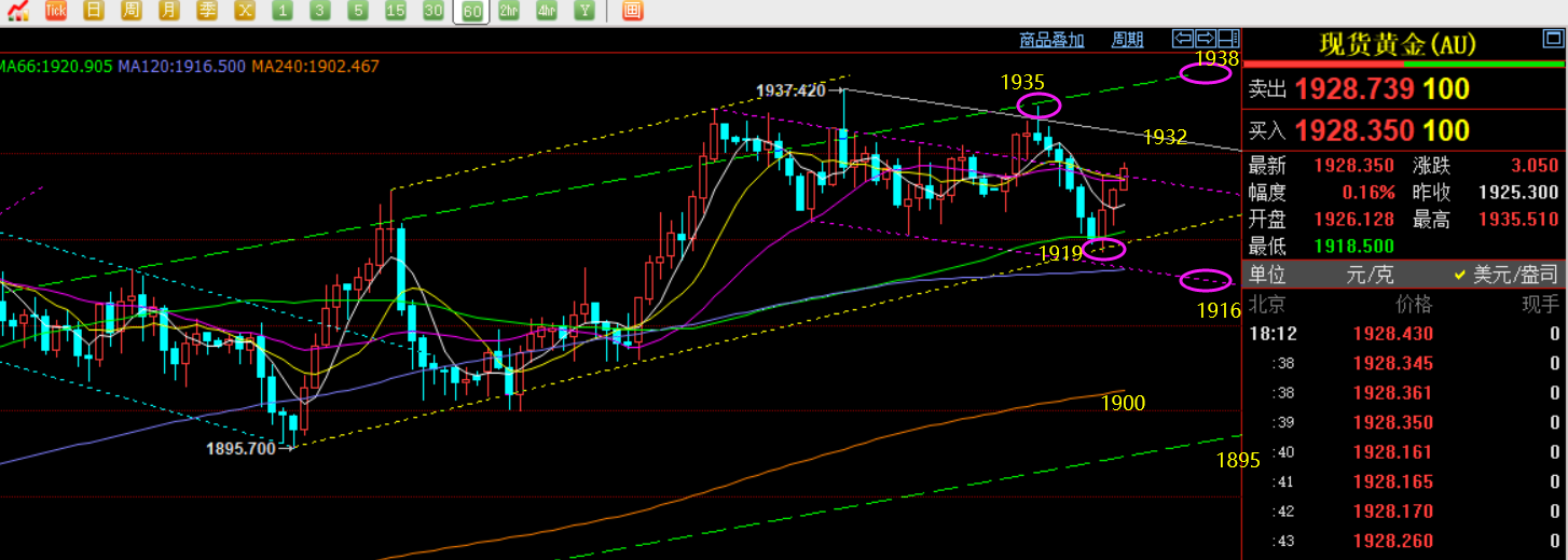 郑氏点银:二次冲高仍未果,黄金先抑后扬仍震荡 回顾上周五行情走势及出现的技术点: 第一,黄金方面:上周五早盘先续涨至1935下承压,而作为震荡行情中,早间续涨或续跌延续性都是较差的,因而容易冲高回落,而当破位小时线10均线有效后,则提示短空跟随,只是空间不大,只有50点,企稳