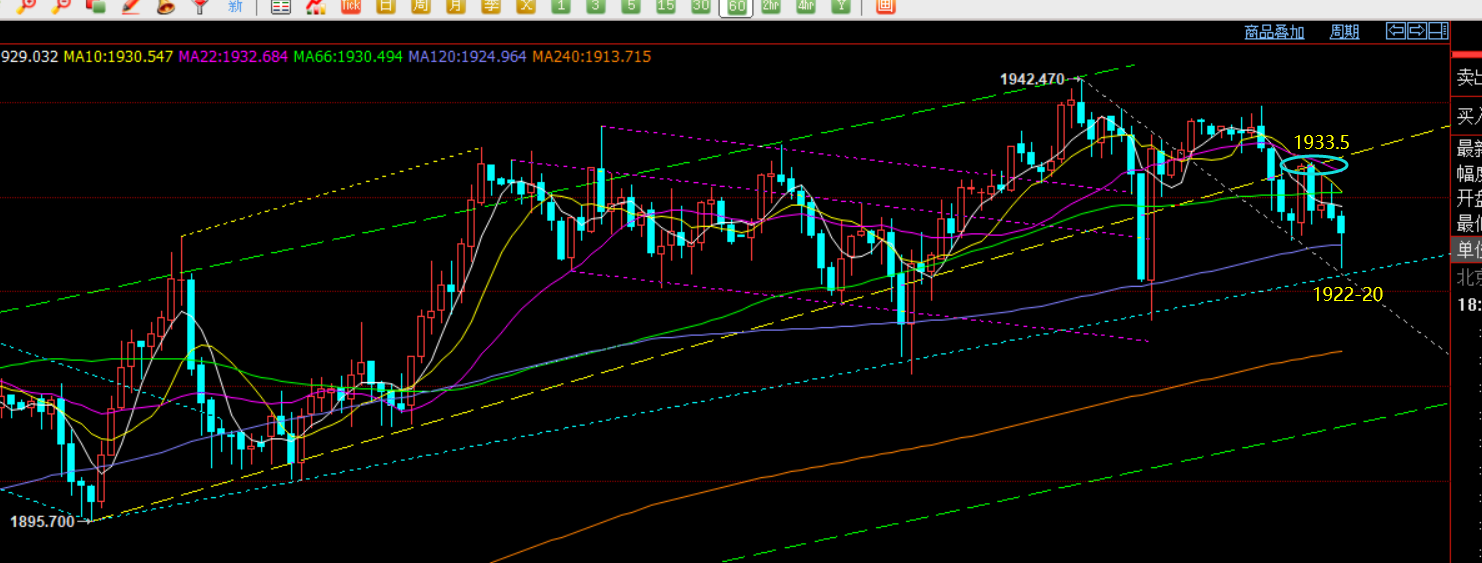 郑氏点银:黄金日线反复回测拉升,10均线得失是关键 回顾昨日行情走势及出现的技术点: 第一,黄金方面:昨日早盘先成功续涨一波,在震荡行情中能成功一早延续的概率还是相对不高,欧盘承压1942-43一线通道反压,提示一旦刺破前高容易压制走跌,而当小时线10均线有效破位后,逼空拉升也就
