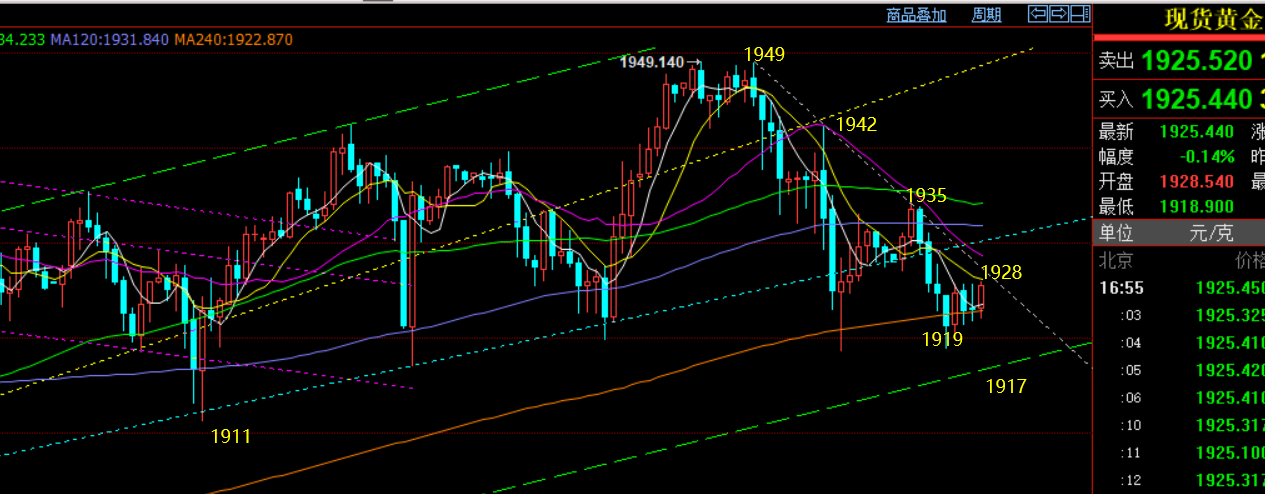 郑氏点银:蓄势待发再摸顶,震荡逼空临尾声 回顾昨日行情走势及出现的技术点: 第一,黄金方面:昨日早盘先拉升一波,承压通道反压1935连跌回测至,这波跌幅拿下,连阴力度不错,欧盘虽有反抽,但只要不破早间高点,美盘仍有二次下探动作,刚好触及日内跌幅618分割阻力再次打压一波至1911一线,这