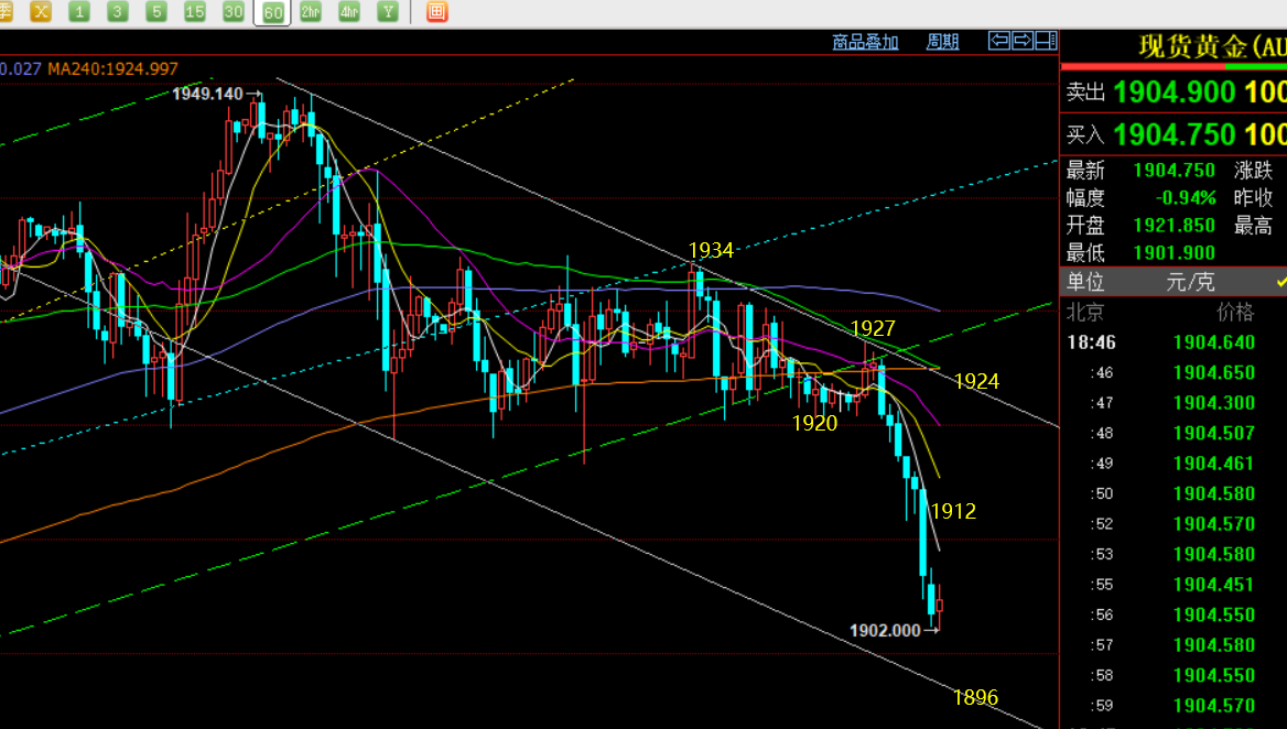 郑氏点银:黄金高位存在反复整理,原油震荡逐步走高 回顾昨日行情走势及出现的技术点: 第一,黄金方面:昨日黄金早盘承压前晚高点,当10点出现大阴回测后,则判断压制有效,提示1916可跟空入场,看日线进一步的震荡回测修正;而午后横盘无法反弹,欧盘就存在进一步的下挫,给到1904一线;由
