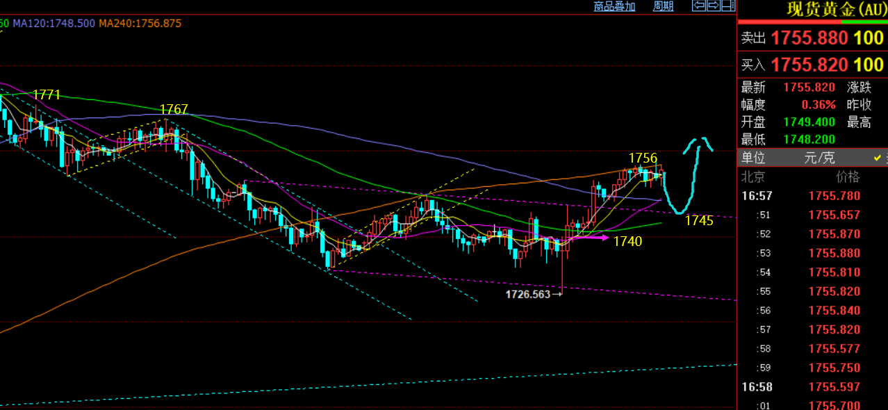 郑氏点银:黄金胶着震荡,短期存在一波上拉至1767 回顾昨日行情走势及出现的技术点: 第一,黄金方面:周一隔夜持续连阴大幅下挫,周二早盘按正常思路布局,则弱势先跟空试探,依托顶底阻力或382分割阻力1746一线,但价格并未下行,而是持续反弹突破了618分割阻力,意味着由隔夜的弱势转