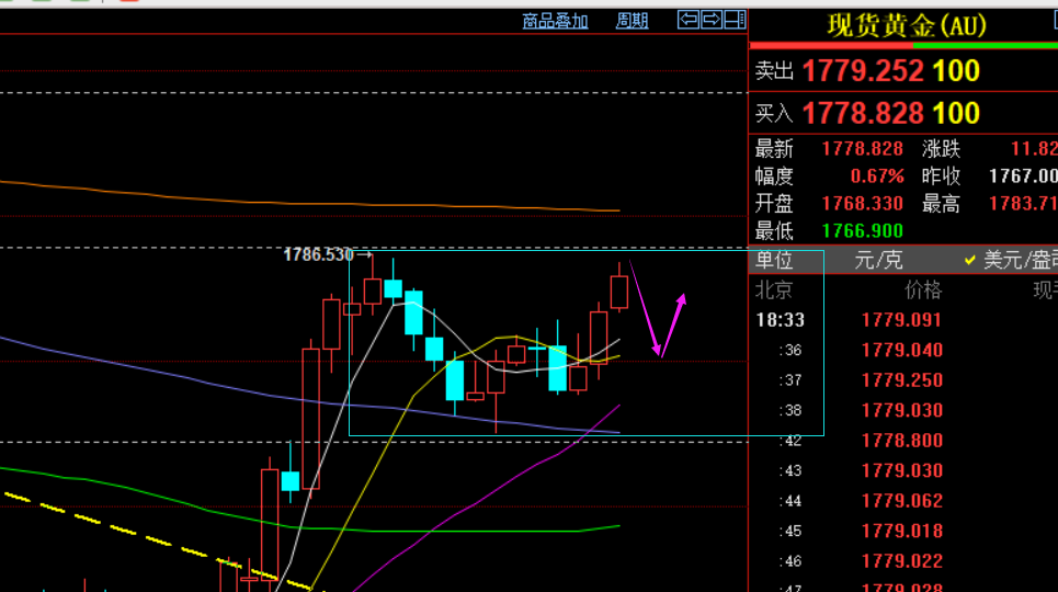 郑氏点银:CI如期走低,今夜加息落地则更上一层 回顾昨日行情走势及出现的技术点: 第一,昨日白盘窄幅震荡,支撑1780,承压1788下,隔夜的下跌通道在欧盘期间,突破1785而破坏,从而结束震荡下滑,就存在一定上涨拉升动能;加之,日线始终有效支撑10均线,短期上涨通道也一直存在,短趋势多头则