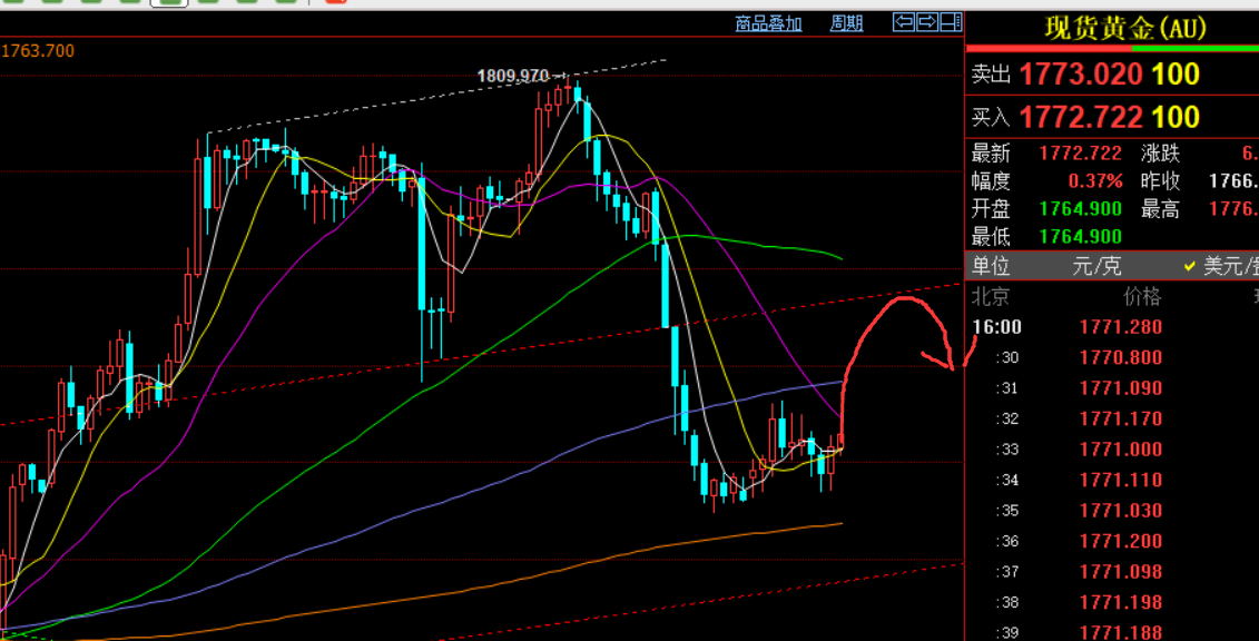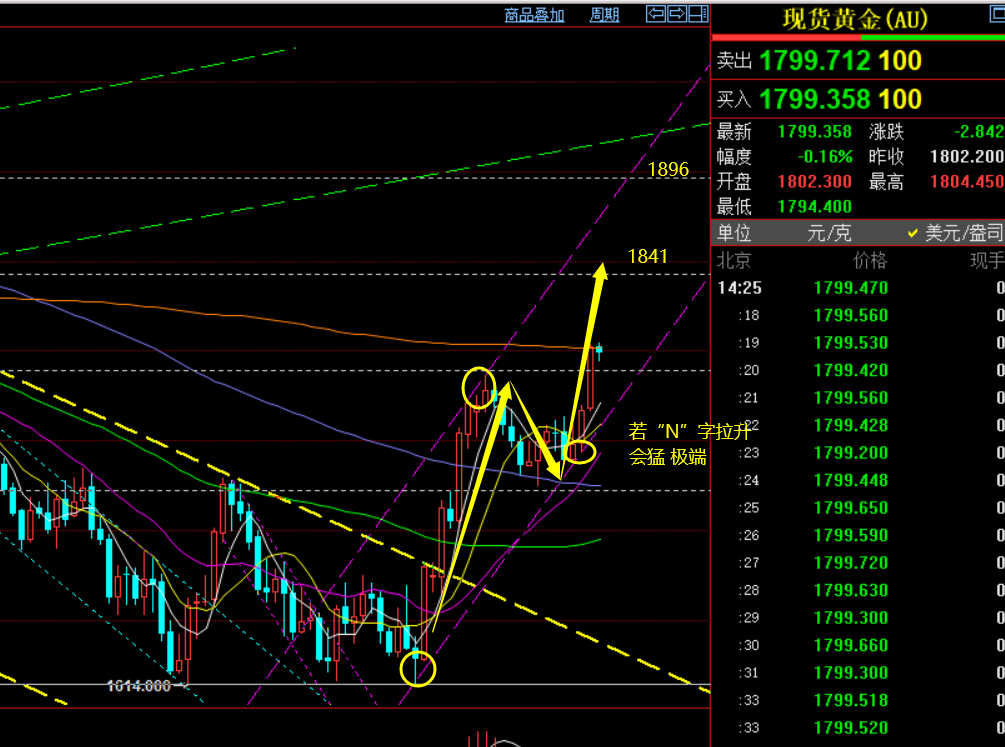 回顾上周五行情走势及出现的技术点: 第一,黄金方面:整体上周五运行于1790-1800区间内仍反复震荡,向下不延续,同样向上不延续,但整体的运行方向处于震荡慢上行发展,最高1806一线,算是通过四个交易日的反弹把周一的大跌给干回来; 第二,白银方面:短期运行明显强于黄金,不仅干回周一跌幅,还刷