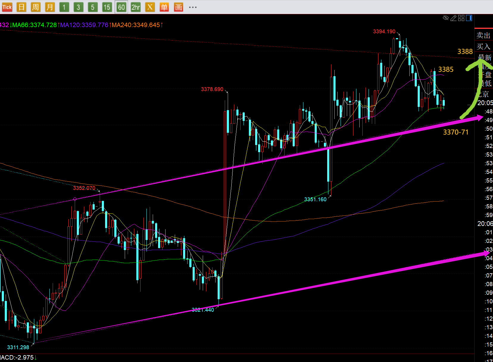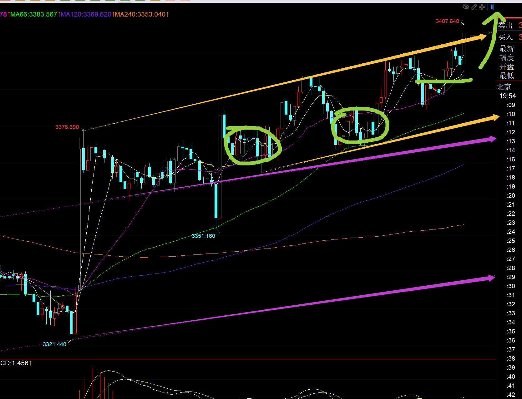 郑氏点银:黄金反复洗盘,日线大阳已明确信号,回踩仍看涨 回顾昨日行情走势及出现的技术点: 第一,黄金方面:昨日早间又是循环先急跌,当刺破隔夜低点后,加上短周期acd底背离,就意味着又容易拉升反弹,配合3120-3268这条趋势线刚好对应支撑点是3310,同时周线,月线到了3300关口重要拐点