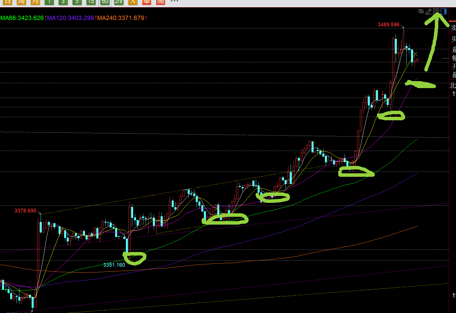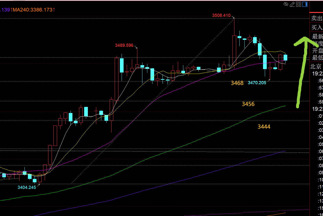 郑氏点银:黄金处于3508之上,继续看趋势拉升破高 回顾昨日行情走势及出现的技术点: 第一,黄金方面:昨日亚盘早间直接续涨30米拉高,则午后回踩顶底支撑3488,刚好也是618分割支撑点继续尝试看涨,以小时线大阳起涨点3477作为防守,可惜欧盘冲高回落,来了一次小洗盘,刺破了早间起涨点,跌