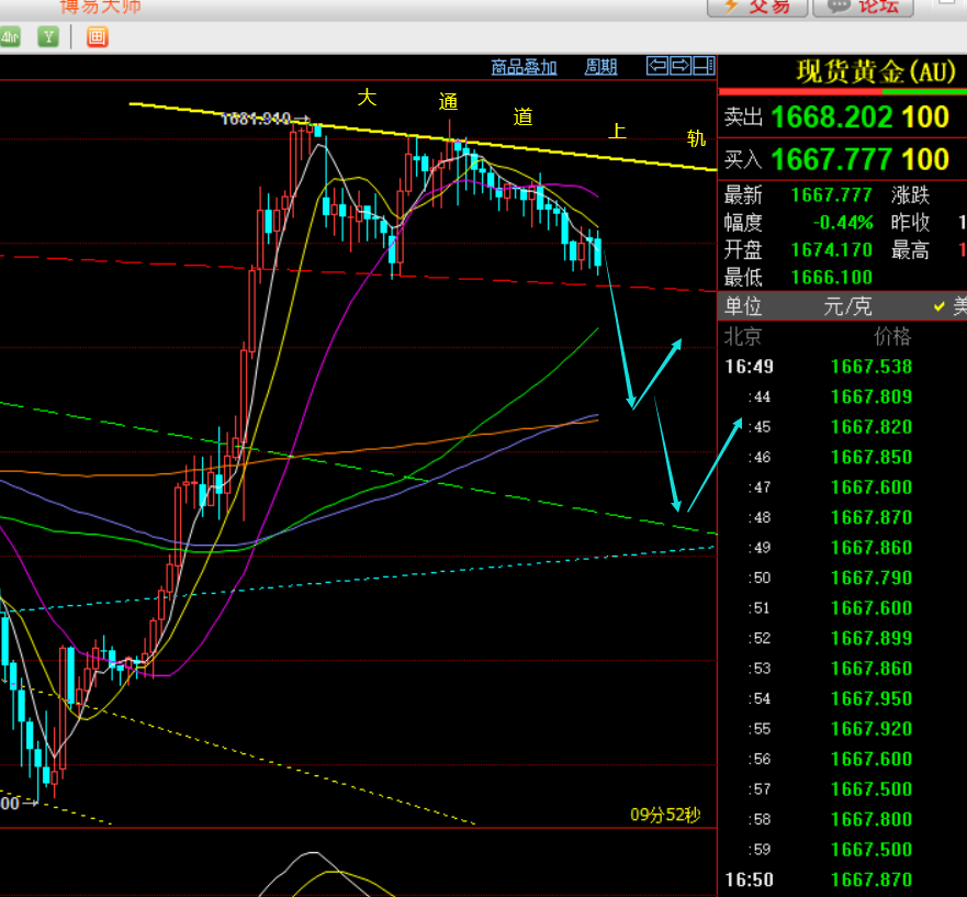 郑氏点银:黄金日线大通道上破,结束弱势格局转震荡上行 回顾昨日行情及出现的技术点: 第一,黄金方面:昨日亚盘连跌震荡下行,欧盘破位前一日低点1666,也就是日线十字K,先向下失守了,认为存在延续下跌空间,去修复下上周五的涨幅,回补完毕日线中轨处再企稳拉升是相对理想的走势;但最终是被