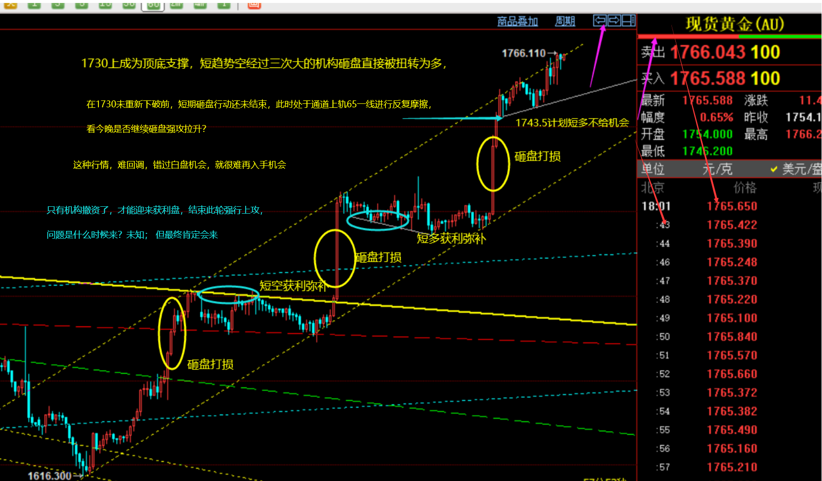 郑氏点银:机构接连砸盘助力,黄金站稳1765将进一步拉升 黄金上周五,本周二,本周四,接连三次机构连续大资金砸盘,强行推动金价持续的飙升,中途还未出现像样的修正,尽管指标严重超买和背离,但在资本家面前,技术指标都将无效;只有机构高位撤资,才会迎来获利盘,类似2070顶部那样,但什么时候谁会
