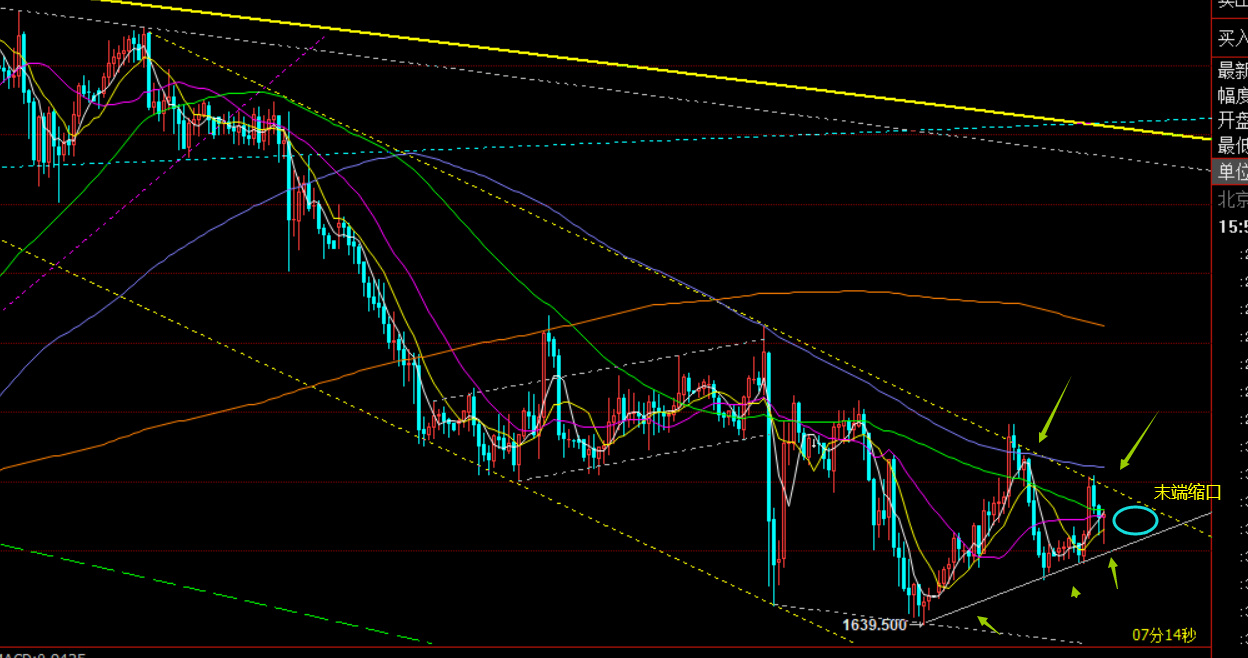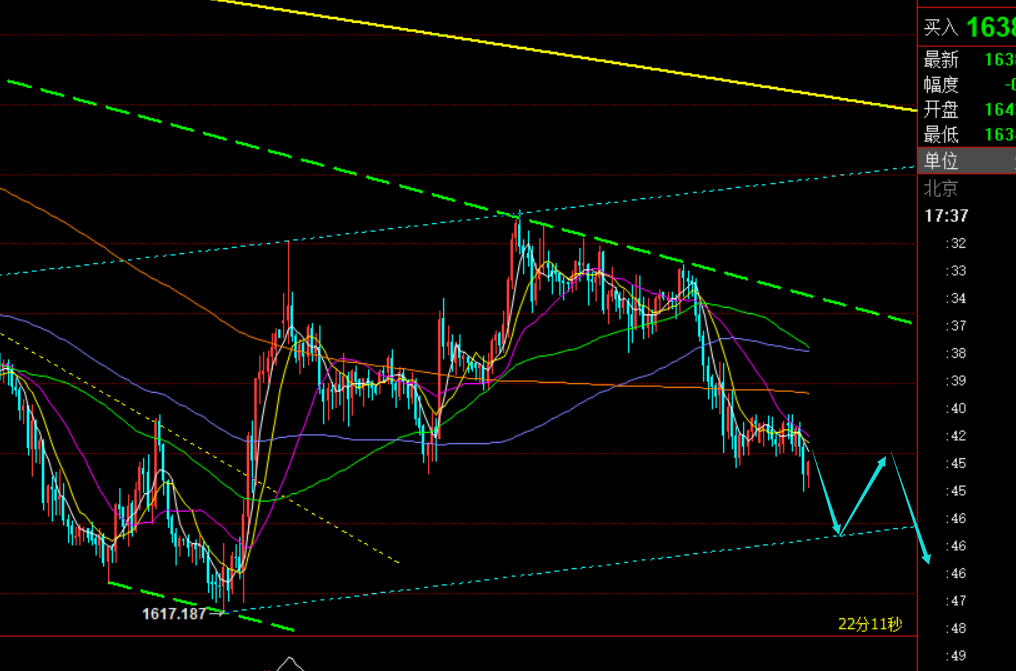 郑氏点银:本年第六次加息宣布临近,黄金先抑后扬 回顾昨日行情走势及出现的技术点: 第一,黄金方面:由于隔夜一路连跌无力反弹,弱势收盘,第二天则反弹继续做空看弱势延续,依托小时线中轨以及短期小型下跌通道的上轨承压下,1637下看压制,但价格并未下挫还是反弹突破了1642开跌口,则失