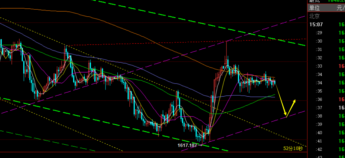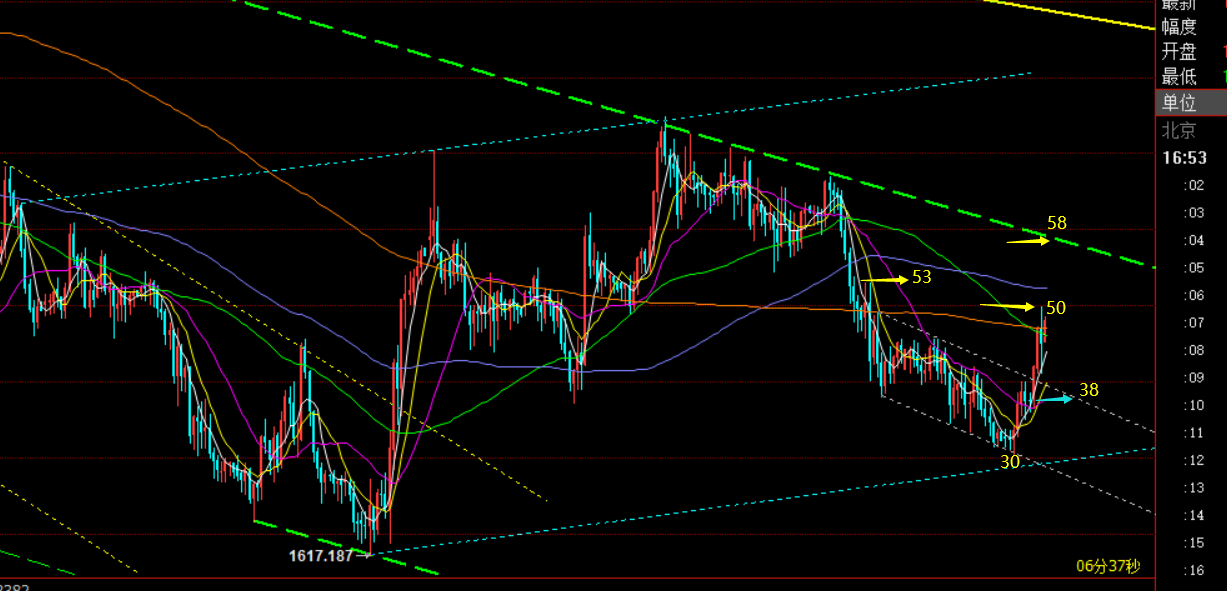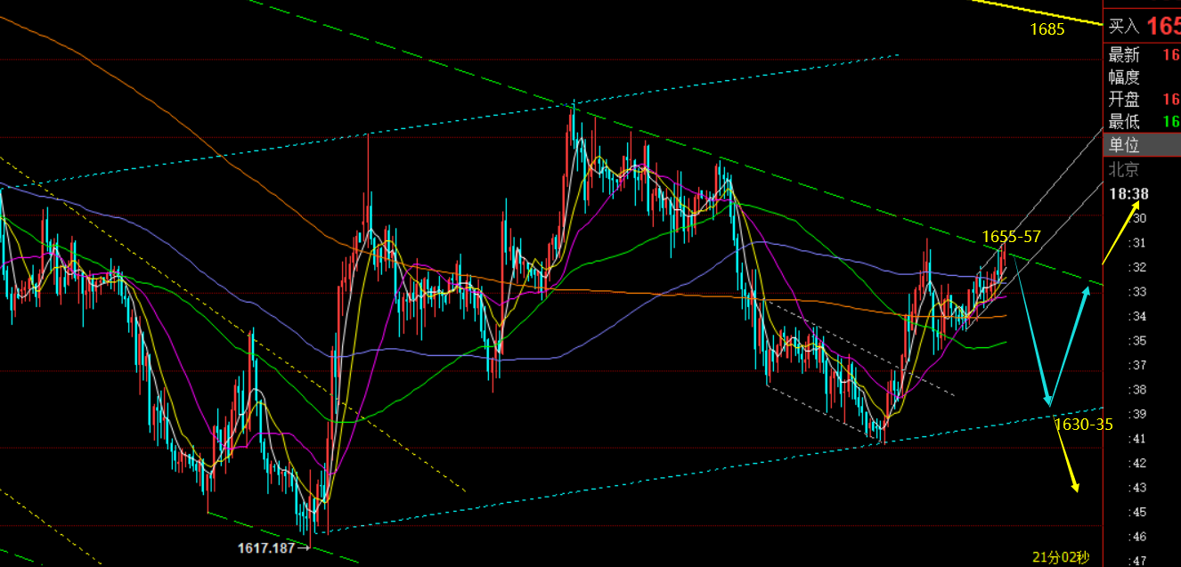 郑氏点银:黄金先关注1650上支撑,原油86.3上支撑 回顾昨日行情走势及出现的技术点: 第一,黄金方面:周一高点1670.5,周二高点1662.2,周一低点1644,周二低点1637,从两高点和两低点相连接,可以形成一个短期下降通道,因此昨日早盘先依托通道上轨1658下尝试空,但价格从欧盘开始直接走高