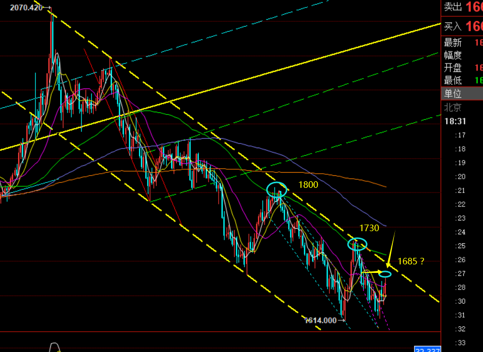 回顾昨日行情走势及出现的技术点: 第一,黄金方面:昨日早盘提示价格已经再次触及短期下降通道上轨位置1652一线,则直接继续空,欧盘如期下跌走低,美盘反弹二次看下行,最低今日抵达了1621一线,而1622-20正是前几天给出的目标位;然而随着时间的推移,这个价格也难以阻挡空头的发力; 第二,白银方