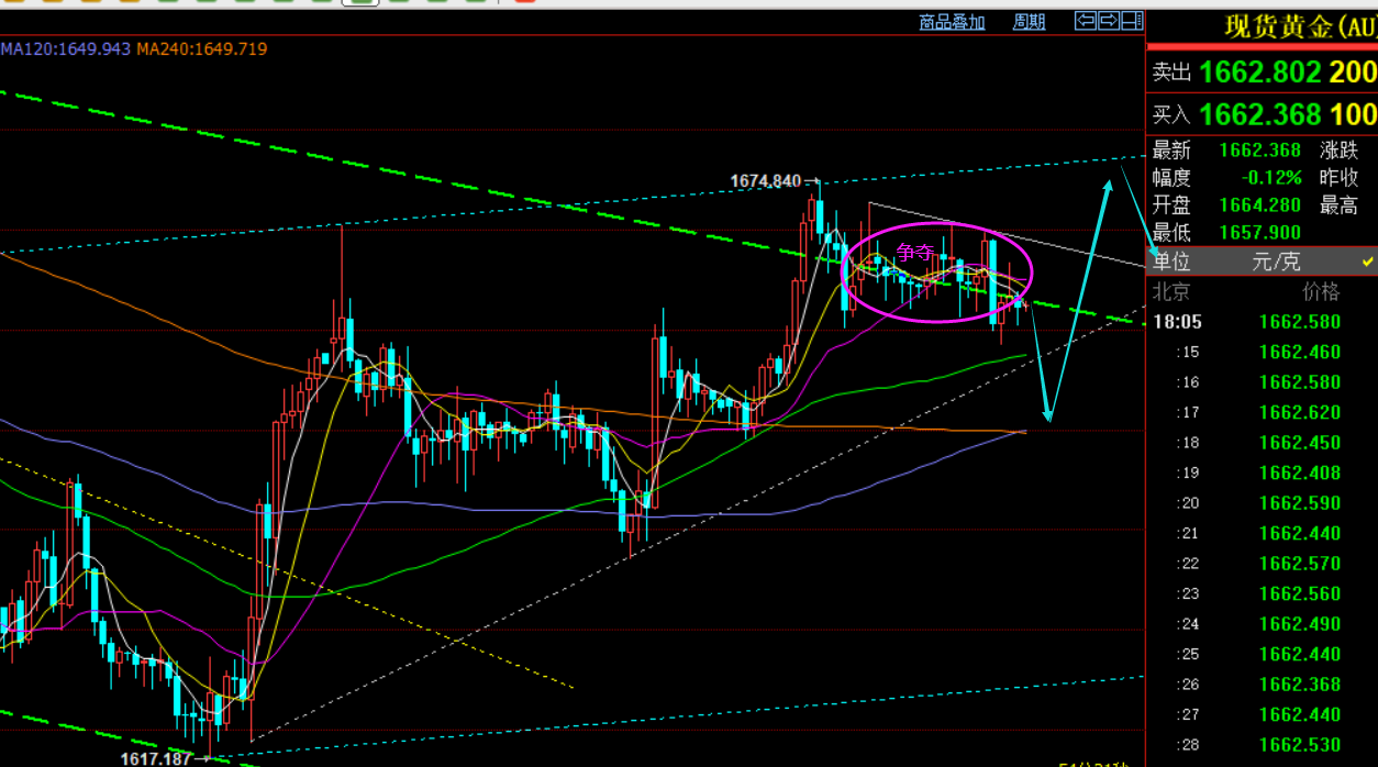 郑氏点银:黄金拐点即将再次临近,原油关注过山车的得失 回顾昨日行情走势及出现的技术点: 第一,黄金方面:从本周初开始笔者针对黄金提出的思路则是震荡修正对待,多空会反复上下运行为主,而整体是缓慢上移,因此价格拉高空,拉低多是周初的操作手法,包括现在也是如此;而周一价格先处于高位