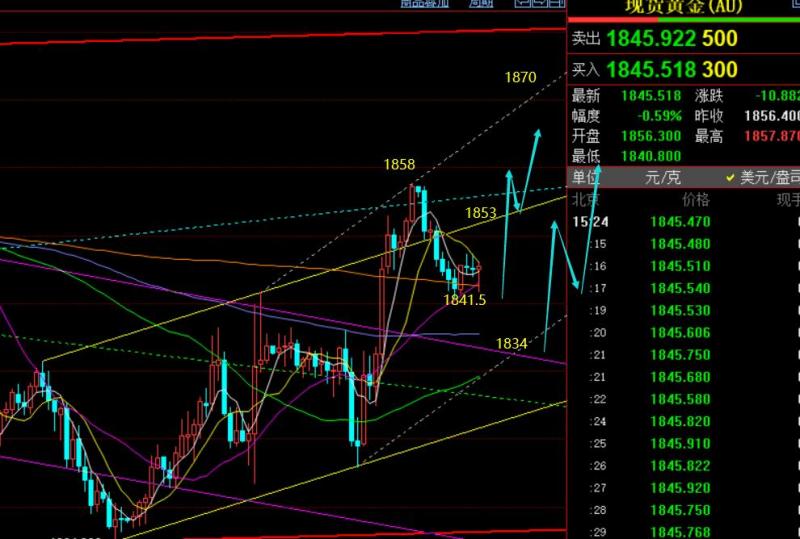 郑氏点银:黄金1850上仍震荡反弹,原油强势逼空上涨 回顾昨日行情走势及出现的技术点: 第一,黄金方面,周二隔夜探底拉升,昨日早盘先压制下滑,并未续涨,那么午后或欧盘就必须跟多一次,而做多点参考几个位置:一个是凌晨低点1849一线,一个是通道回踩点1846一线,一个是618分割支撑1844一线,都是