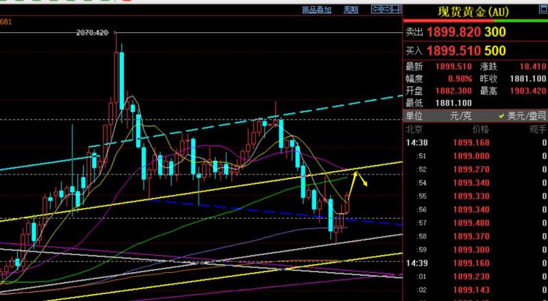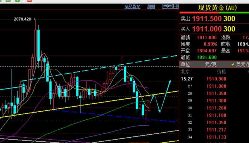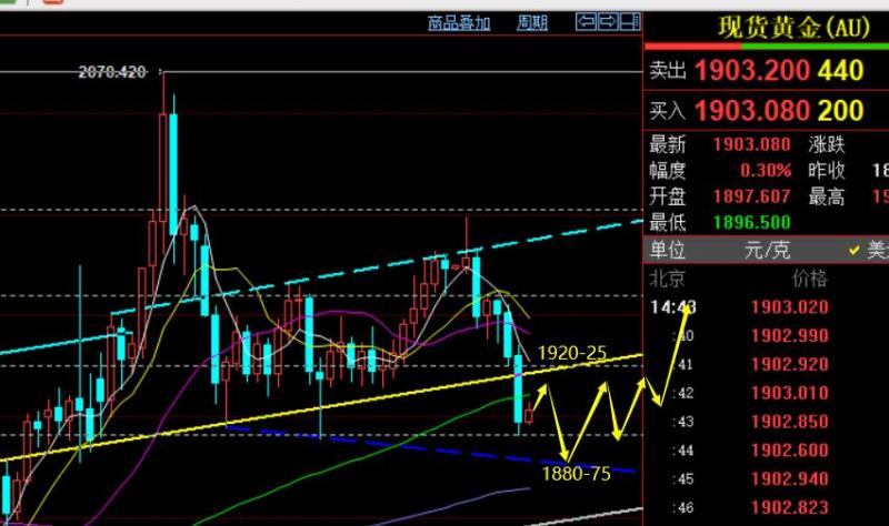 郑氏点银:黄金1900上延续先看反弹,原油102.8上继续涨 回顾昨日行情走势及出现的技术点: 第一,黄金方面,周三隔夜冲高压制走弱,昨日早间开盘直接续跌阴跌下滑,首次触及1877-78关键趋势支撑线时(1895-1889连接的衍生点),并未出现理想的快速反抽走势,则保守原点位调仓多单后观察欧盘走势再