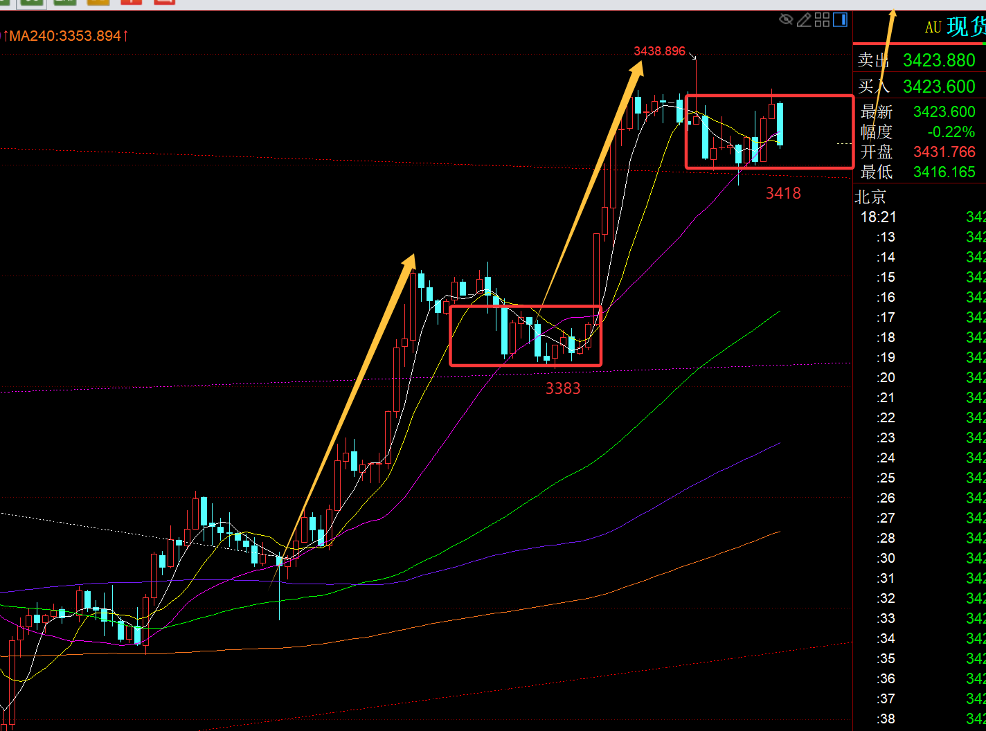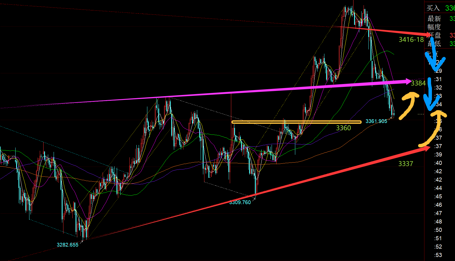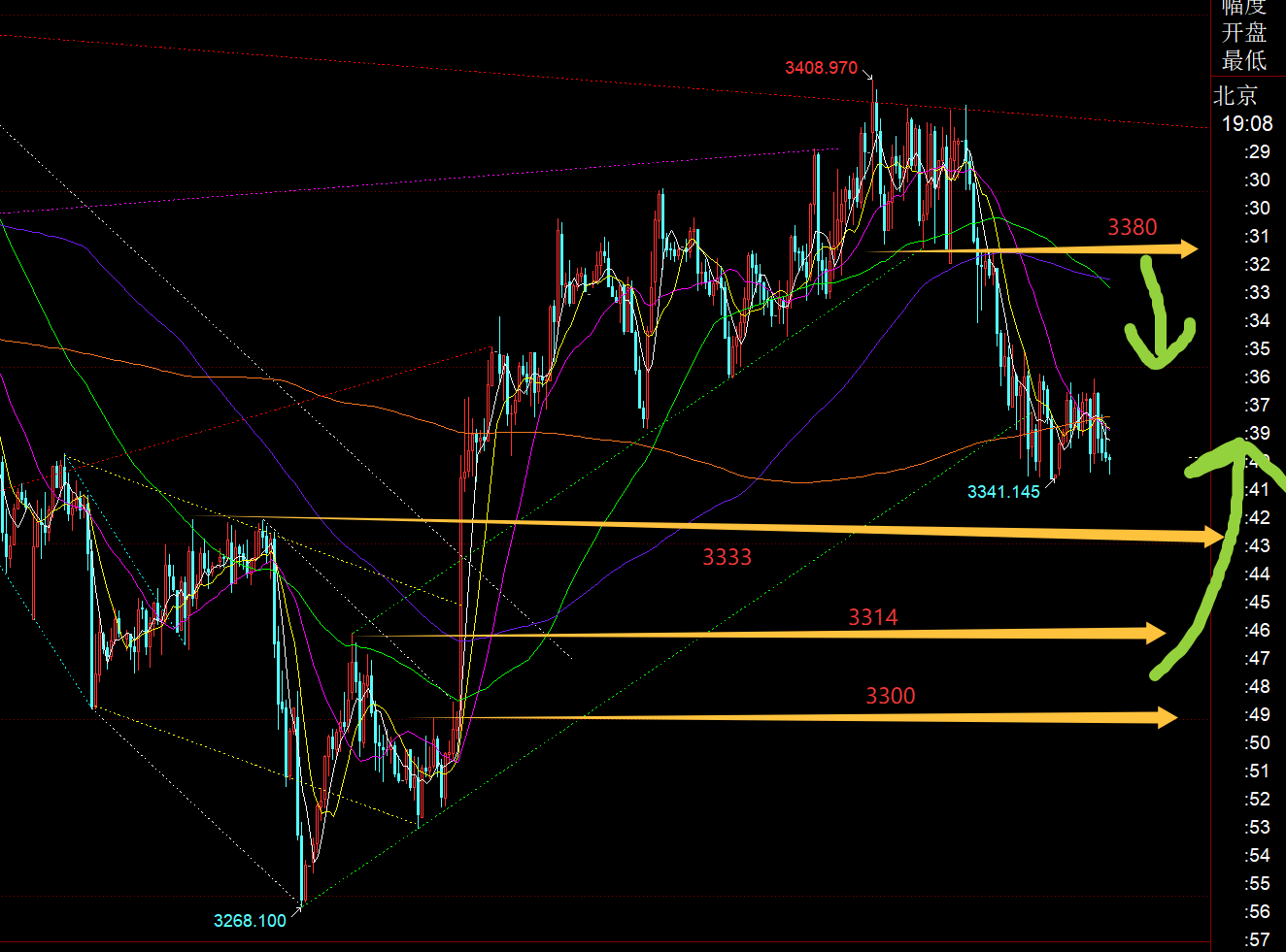 郑氏点银:黄金日线大阴承压回调,等待3300之上再次企稳 回顾昨日行情走势及出现的技术点: 第一,黄金方面:上周五一直围绕3400-3380这20米区间内跑了一天,而昨日开盘仍承压3400无法站上,由于日线收线还是处于5日之上,且是长下影十字K,和前一天阳线形成右肩十字长组合形态,在一路拉升过