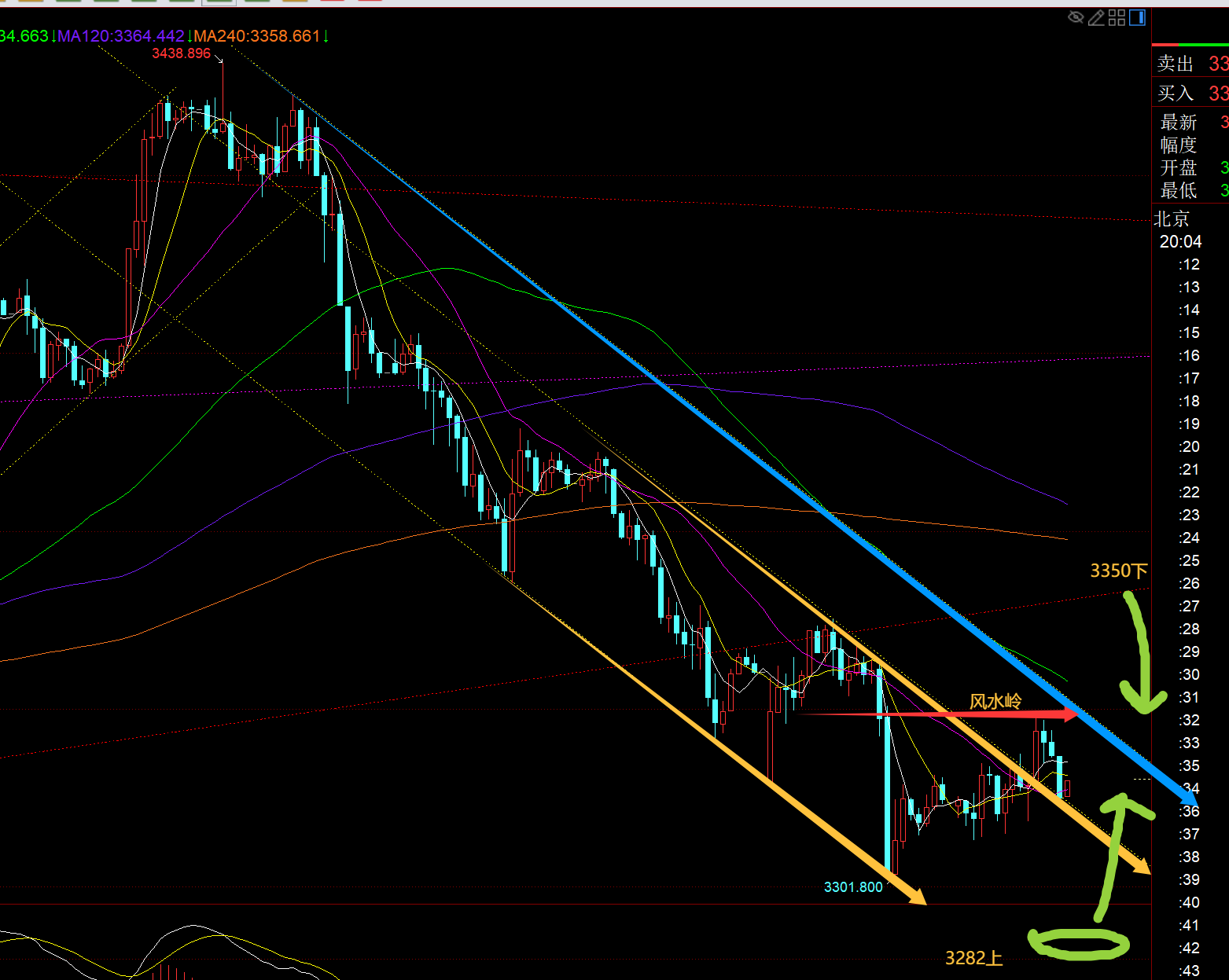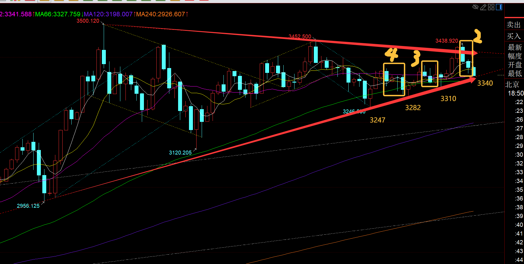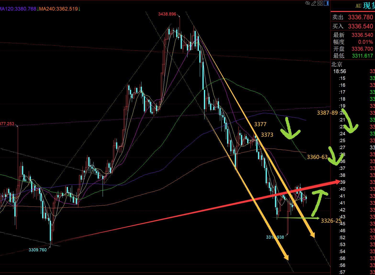 郑氏点银:黄金再次逼近大收敛三角下轨,3340上下能否起飞 回顾昨日行情走势及出现的技术点: 第一,黄金方面:昨日开盘直接压制走弱,延续隔夜跌势进行下调,而且日内是一路阴跌,这种走势想反弹跟空没机会,急着提前去多基本会一路损,和逼空一路拉升是一个道理,只要一早没上车,之后就基本只能看