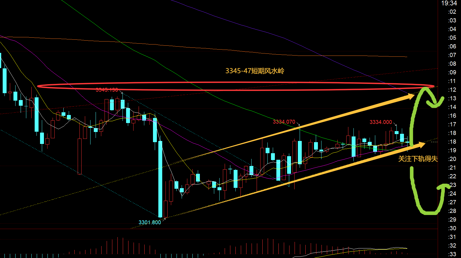 郑氏点银:今晚非农,黄金3300做风水岭,突破站稳则看反转 回顾昨日行情走势及出现的技术点: 第一,黄金方面:昨日早间迎来一波难得持续的连阳小V拉升,当10点收报饱满大阳,重新短期通道之内,则回踩3288之上提示跟随看涨,一波拉升至3315一线高点;欧盘回踩一波确认小时线中轨3294继续
