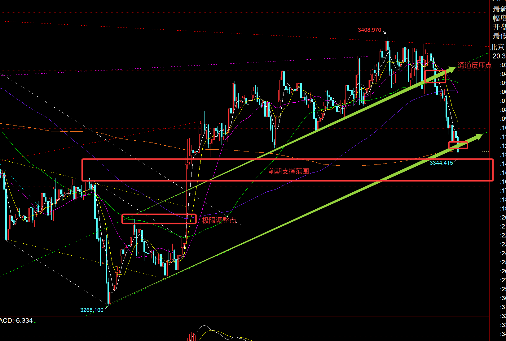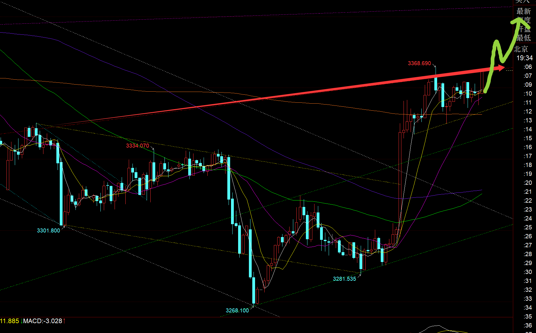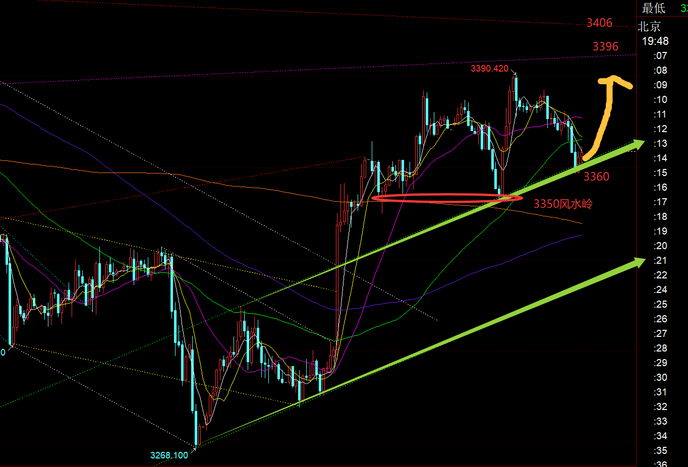 郑氏点银:黄金非农大涨之后,今日周一震荡缓慢向上 回顾上周五行情走势及出现的技术点: 第一,黄金方面:早间先震荡回踩下跌一波,低点3281一线刚好是短期通道下轨支撑点,也是3314-3268靠近这一波的618分割位置,因此这里提示继续看涨,作为上周四底部小V拉升之后的延续;午后成功拉升至32