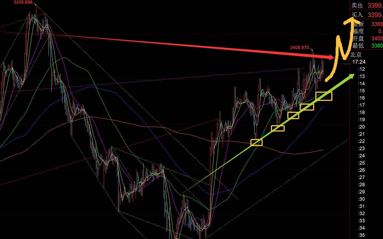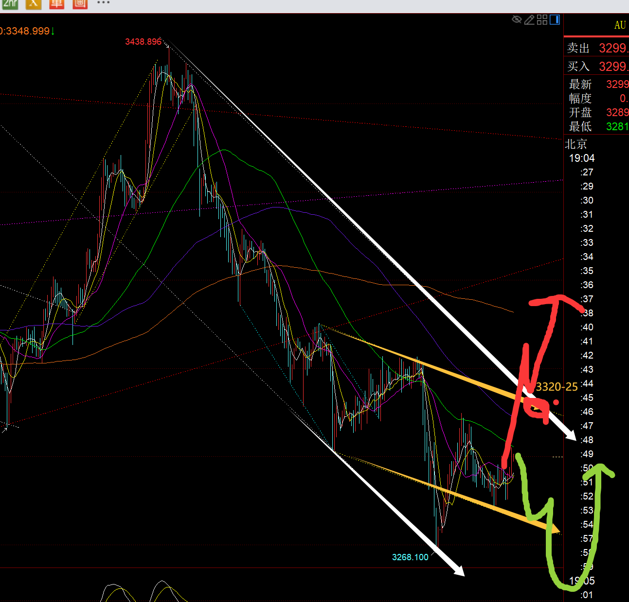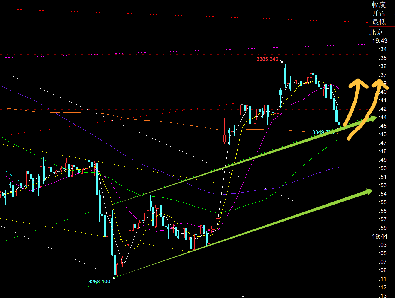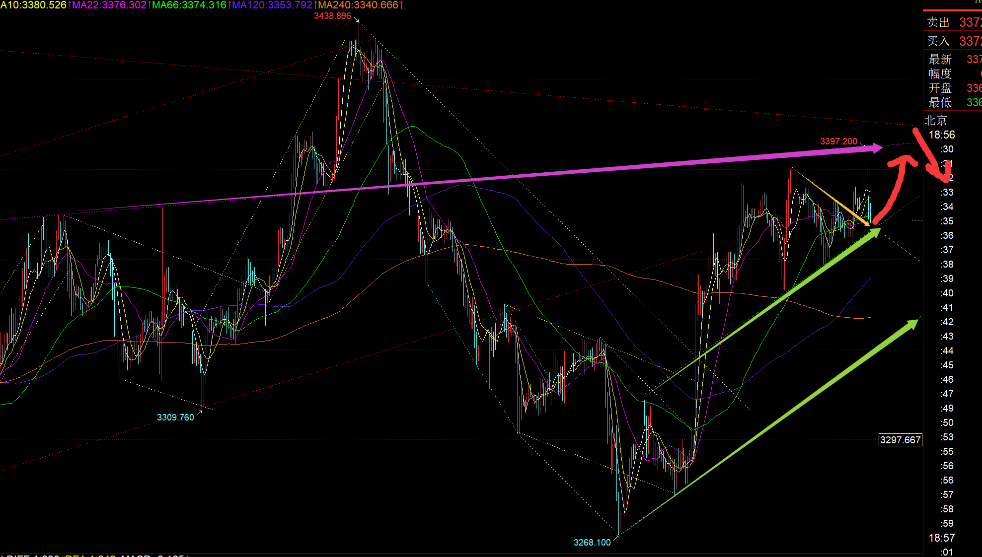 郑氏点银:黄金非农大涨之后,今日周一震荡缓慢向上 回顾上周五行情走势及出现的技术点: 第一,黄金方面:早间先震荡回踩下跌一波,低点3281一线刚好是短期通道下轨支撑点,也是3314-3268靠近这一波的618分割位置,因此这里提示继续看涨,作为上周四底部小V拉升之后的延续;午后成功拉升至32