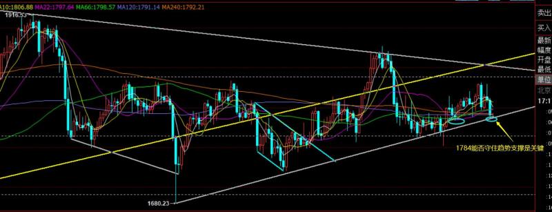 郑氏点银:黄金非农能否守住1784最后反弹防守是关键 今日时间关系,简单图示讲下,晚点再通过视频解读来综合阐述今日技术观点: 上图是黄金日线走势:1680支撑以来的底部趋势线稍做修正,可以看出隔夜低点1787刚好处于下轨,同时1784是上次美联储1753短期底部企稳后的次低点,作为今日非农,1