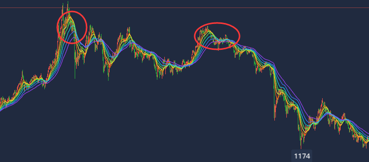 1、上图为日线级别历史高点下跌前的图形,上图很明显,行情不是单边下跌,而是震荡了很长时间才迎来的瀑布行情,下跌前出现了瀑布线粘合勾头信号(不懂瀑布线的同学可以去学习一下,对于中线投资者非常实用,准确性非常高)一旦瀑布线出现粘合勾头信号,中线空单可以开仓进场,首仓开仓不能太重,进5%-8%的仓位即可,一旦瀑布线出现第二次粘合勾头,这个时候再去加仓5%-10%,如果反弹给出第三次这种信号,那么可用整体仓位的30%去布局了,目前我在这里大致先给一个,黄金下方看到1645可减仓,第二目标看至1450可离场(这个周期会比较长,仅针对中线交易者)