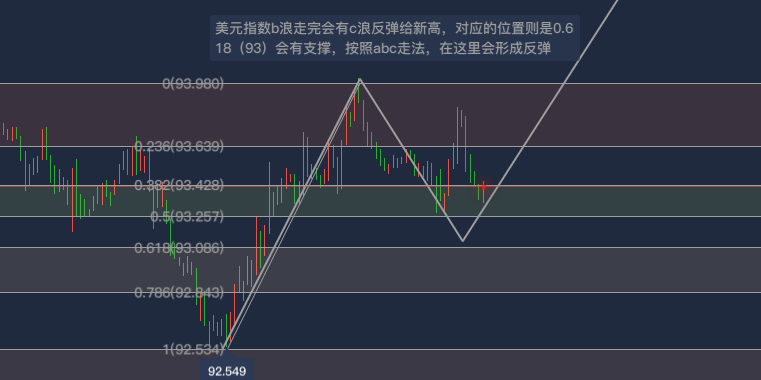 3、美指92.54止跌形成反弹abc调整,目前正处于b浪调整中,因94前高未破,故而不能判断b已经走完,目前下方是受到黄金分割线0.5的位置93.27这里的支撑,向下调整理应会在0.618位置93.09再反弹给新高是合理走b,所有美指大概率会在0.618-0.5形成反弹,反弹后走c会给黄金带来很大的压力,重点关注一下。