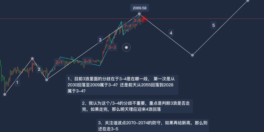 1、黄金目前2070谐波位置压力暂时有效,冲高后最低回落到2049,但是在大级别上仍然不算远离,无法证明之前我说的小5浪已经结束,但2070这个位置确实比较强,在没确认前,可以暂时先不做这个考虑。此外,2070谐波第一次过不去与之前2030谐波位置一样,如果后面再次到2070以上,则下一个谐波点大概是2110左右。再次提醒一下,暂时不要去依托2070看中线空,时机还不成熟,就算做4浪回落也要等2030突破反弹后再做空。这样更符合稳健风格。